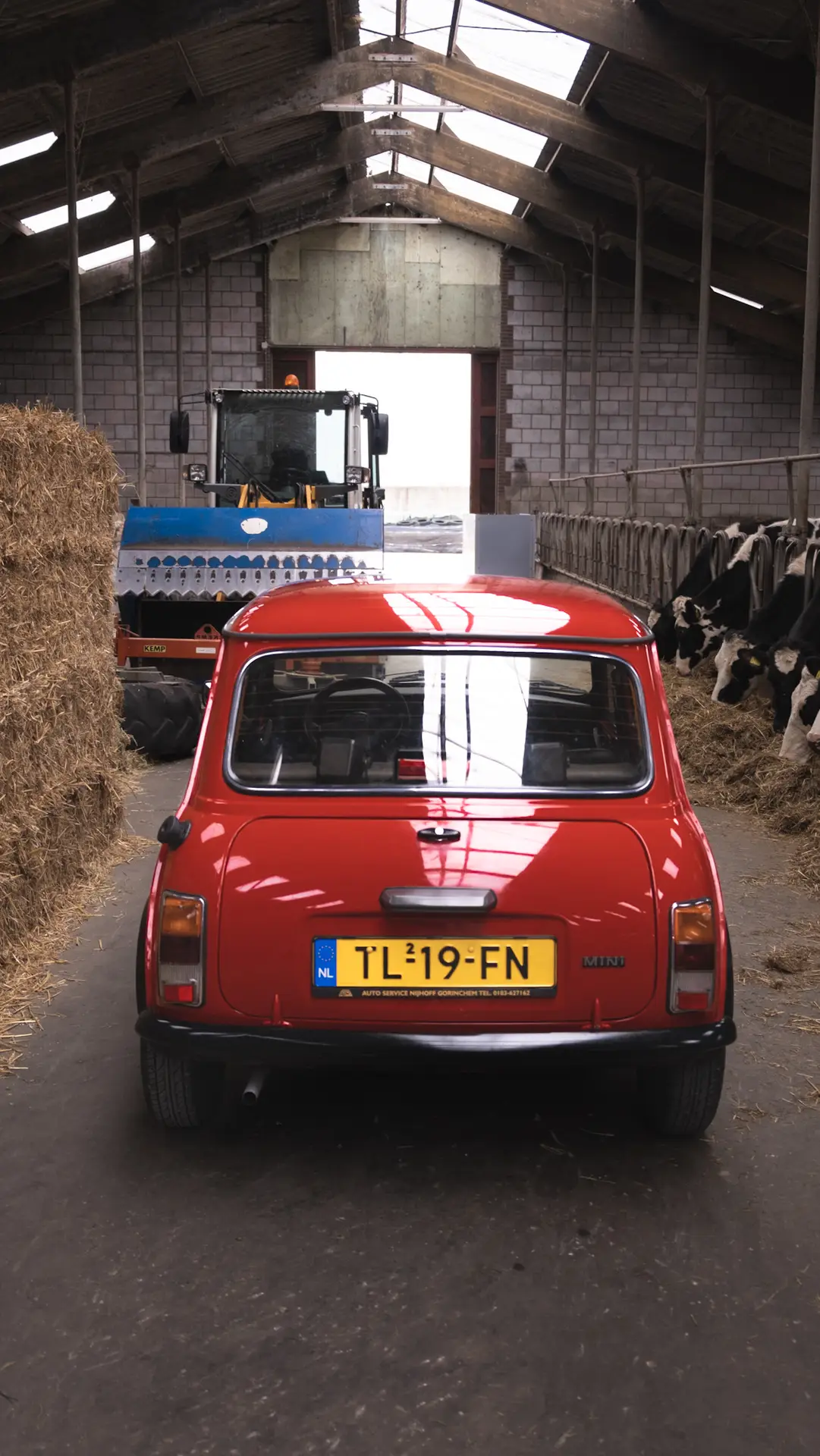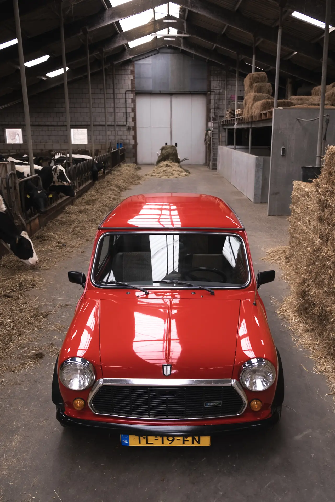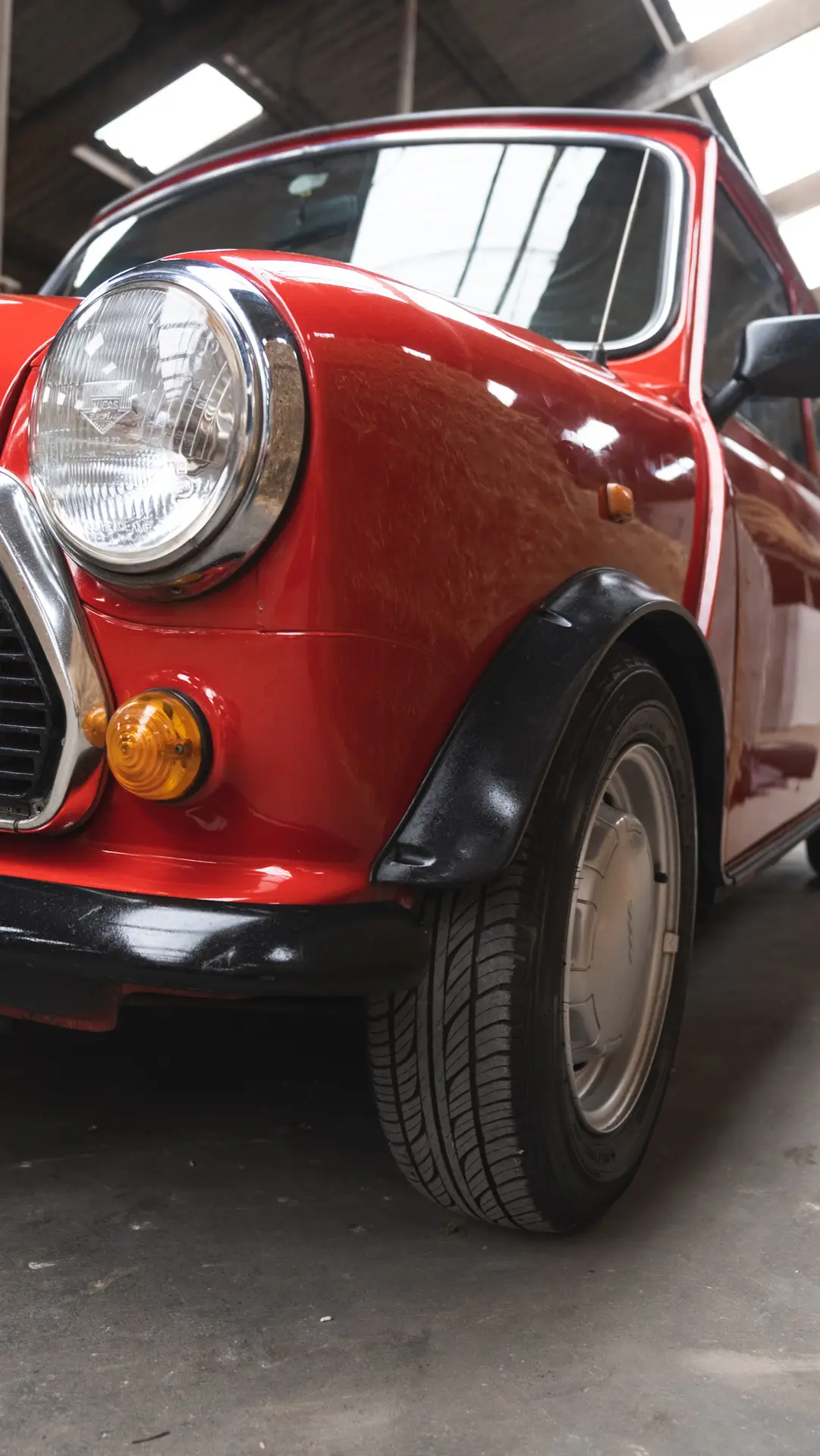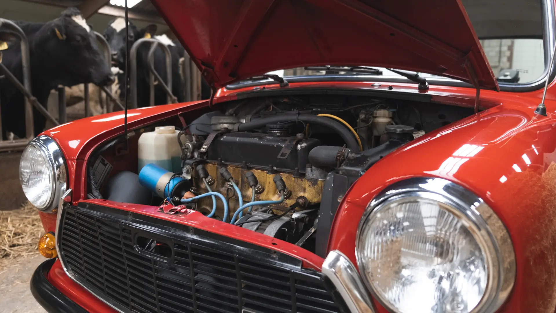 A red Austin Mini 1000 E Magic standing in a barn with the coating shining bright