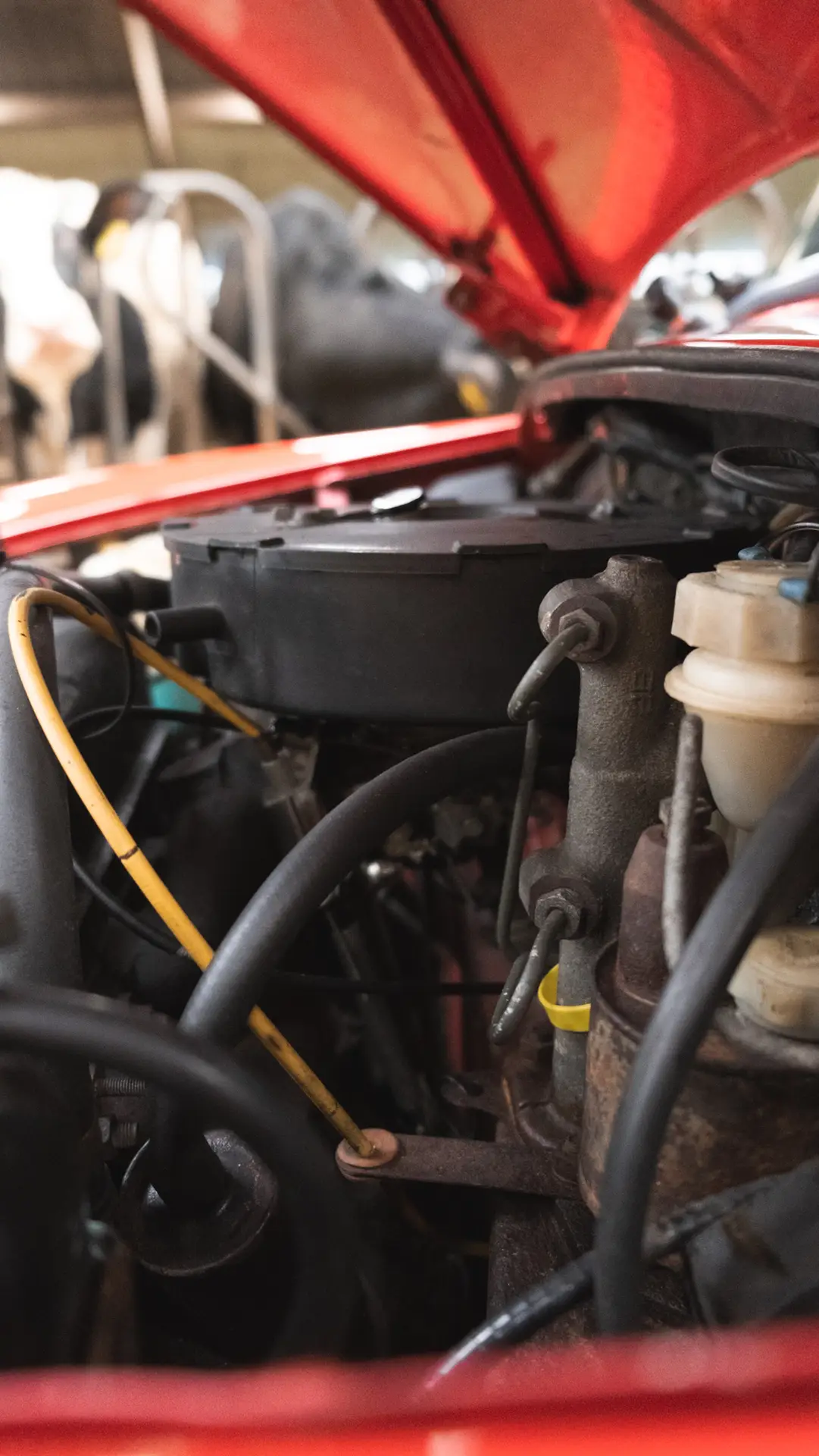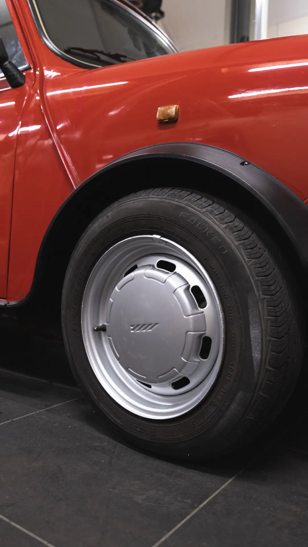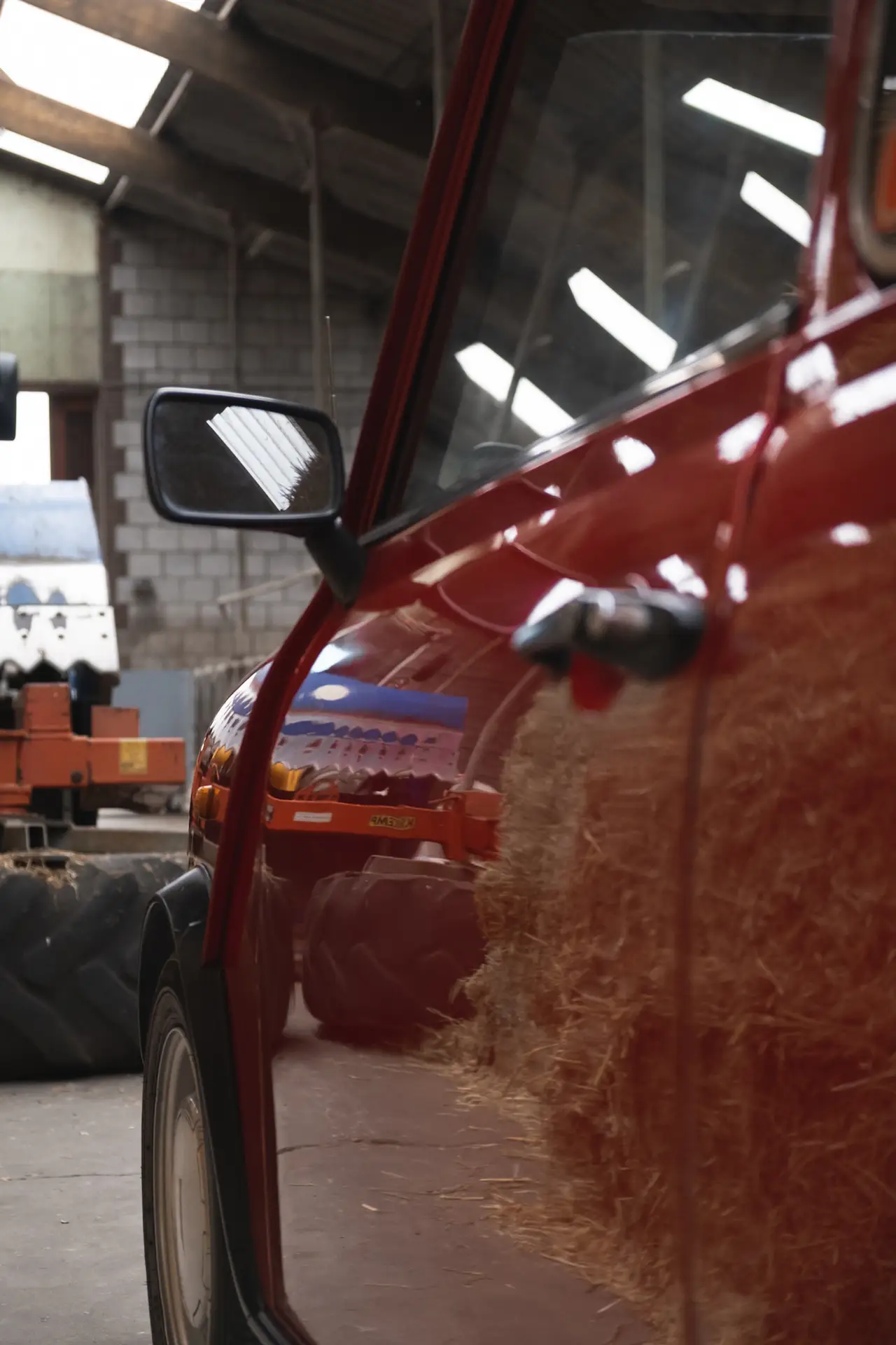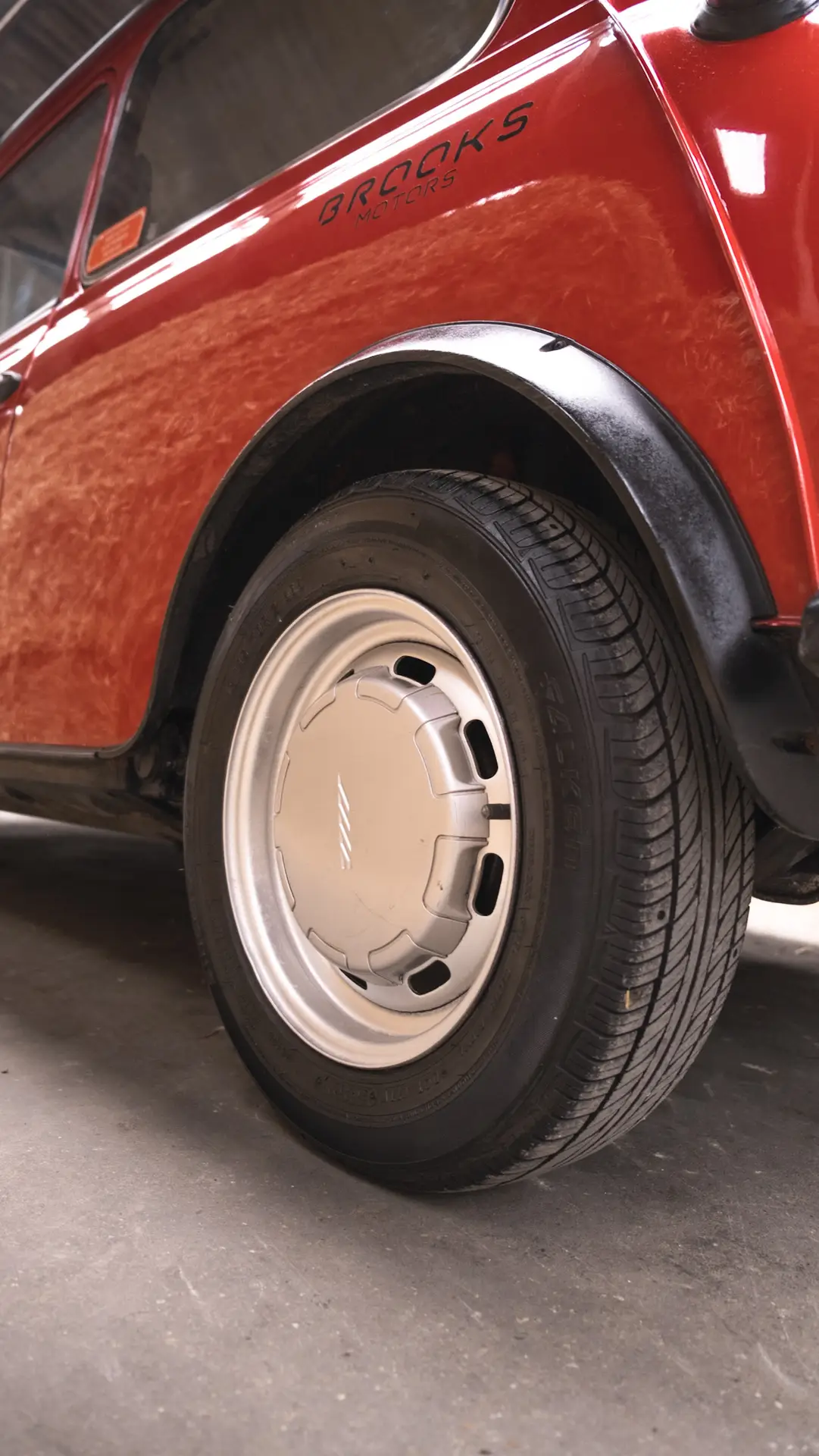 A red Austin Mini 1000 E Magic standing in a barn with the coating shining bright