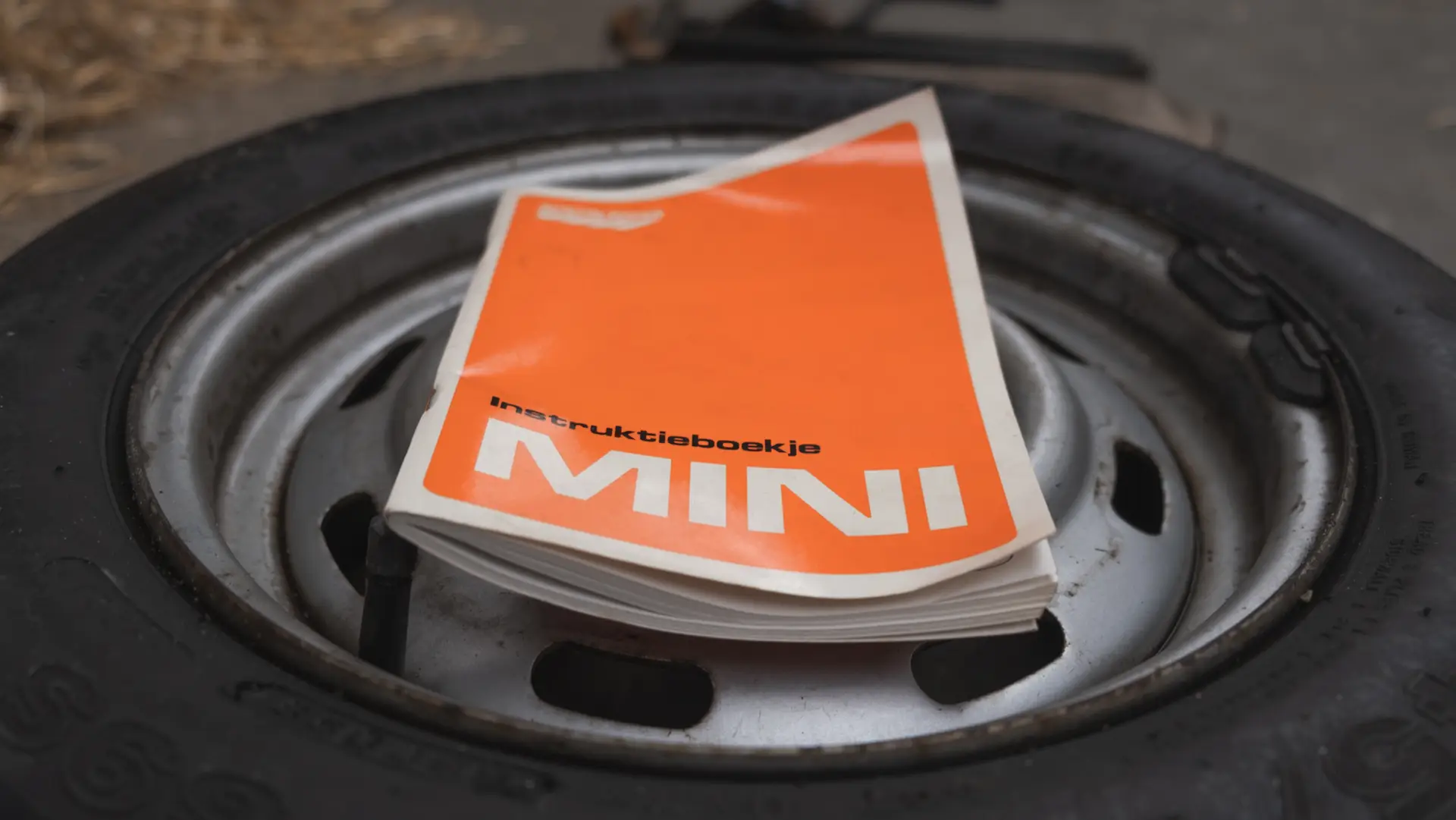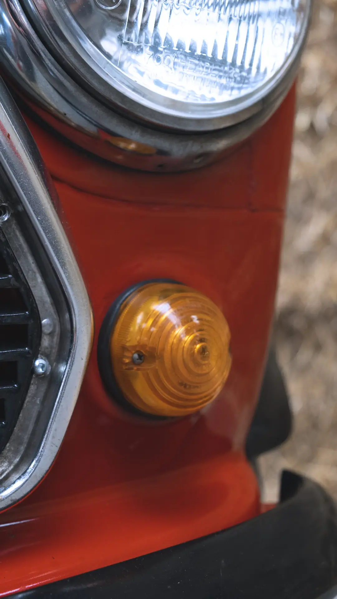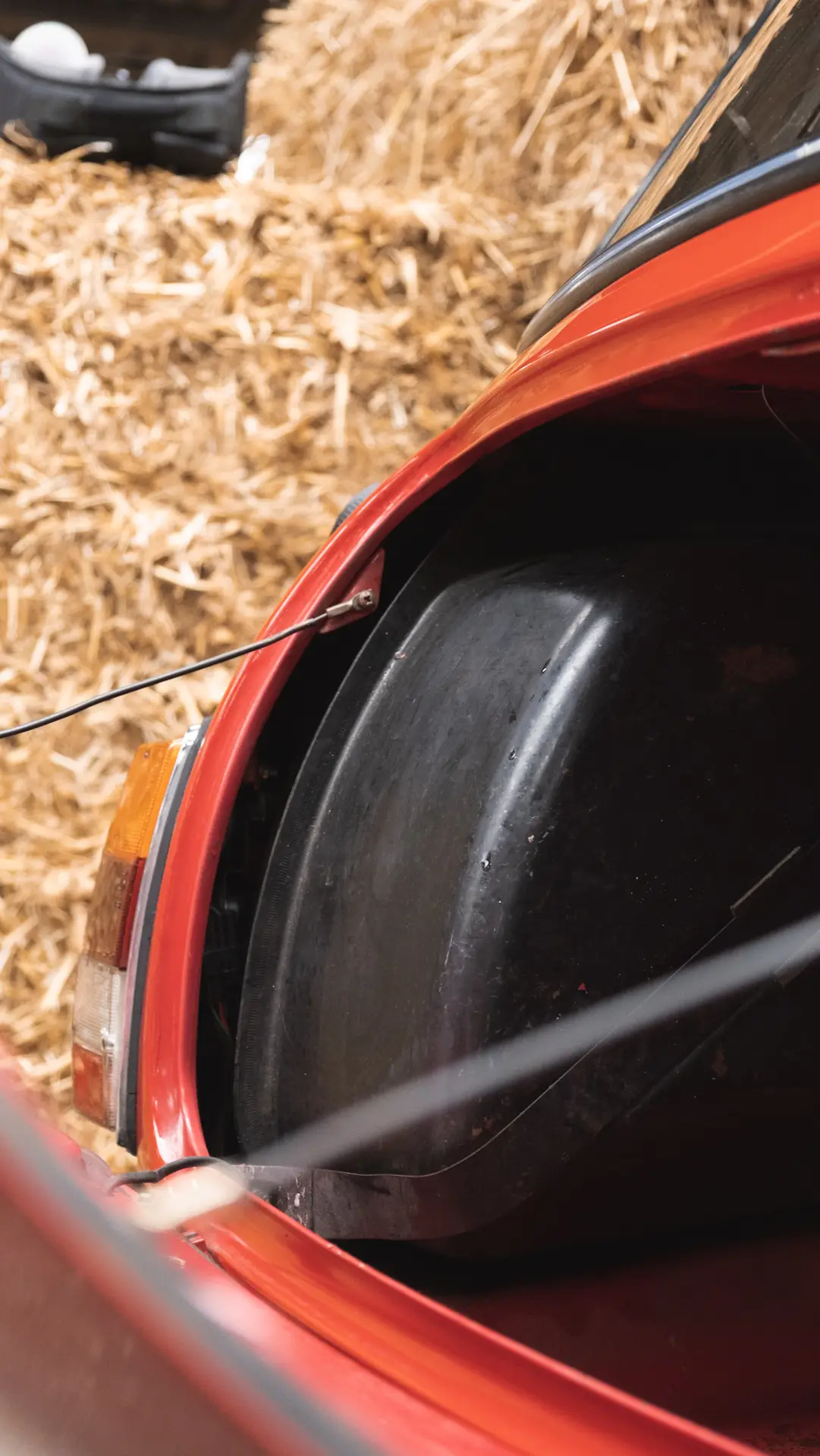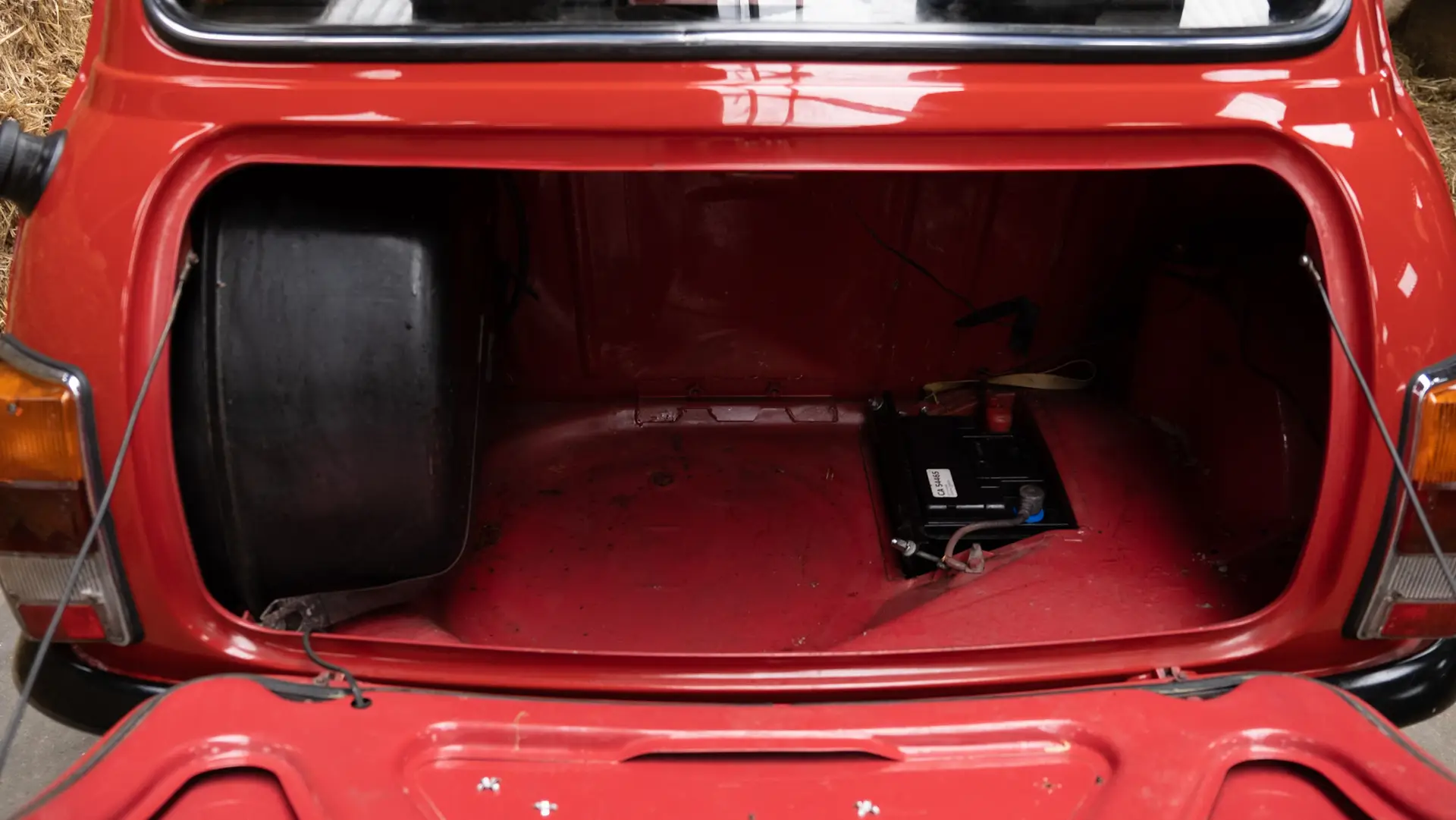 The back of a red Austin Mini 1000 E Magic with straw on the left