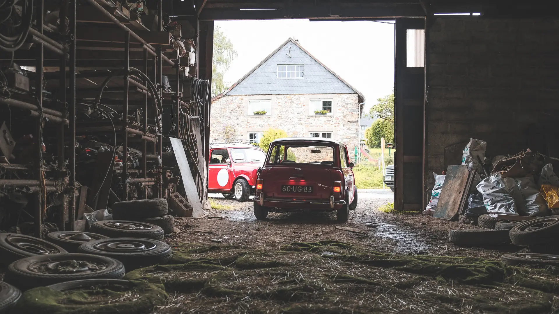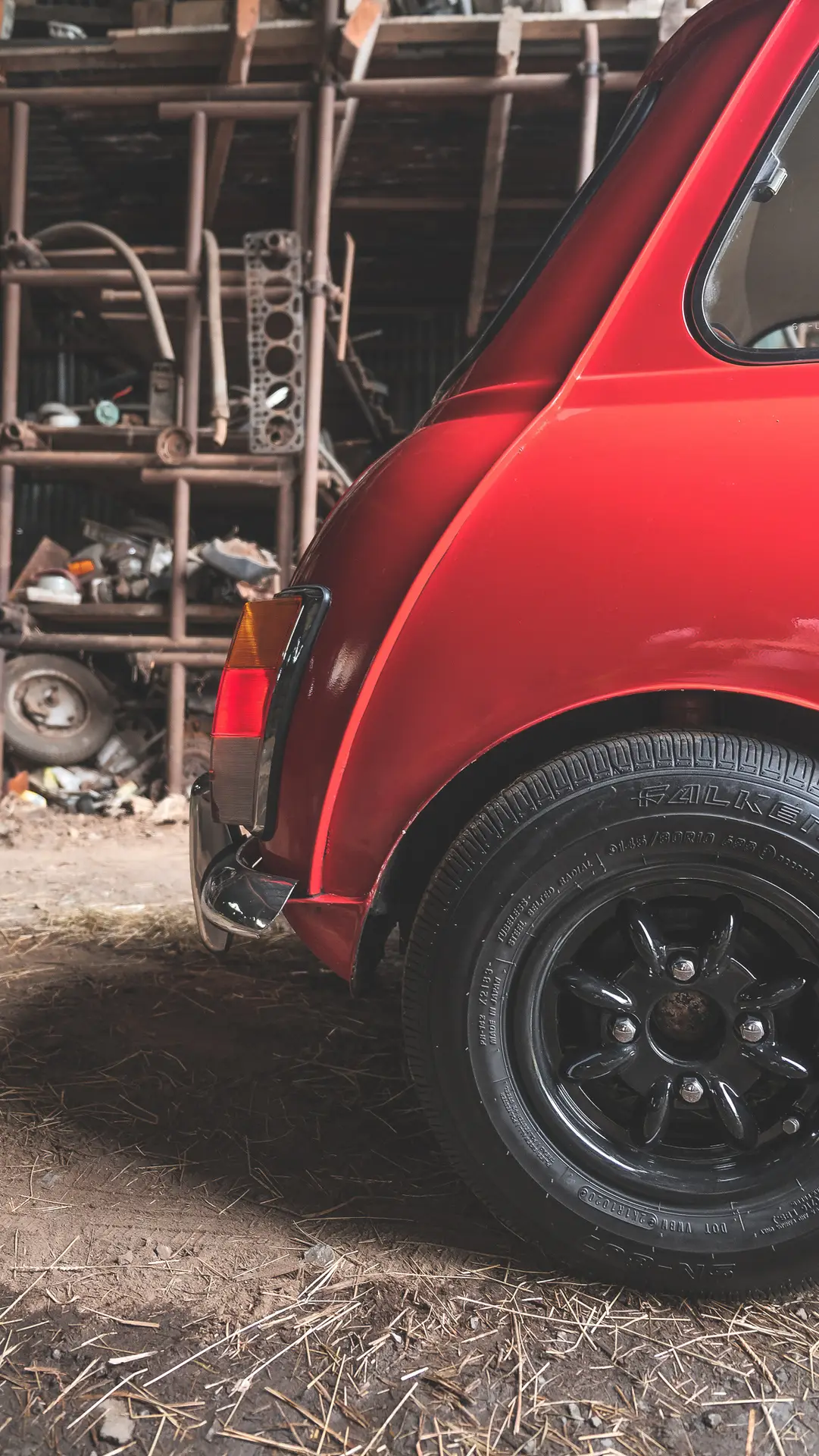 A red Austin Mini 1000 E Magic standing in a barn with the coating shining bright