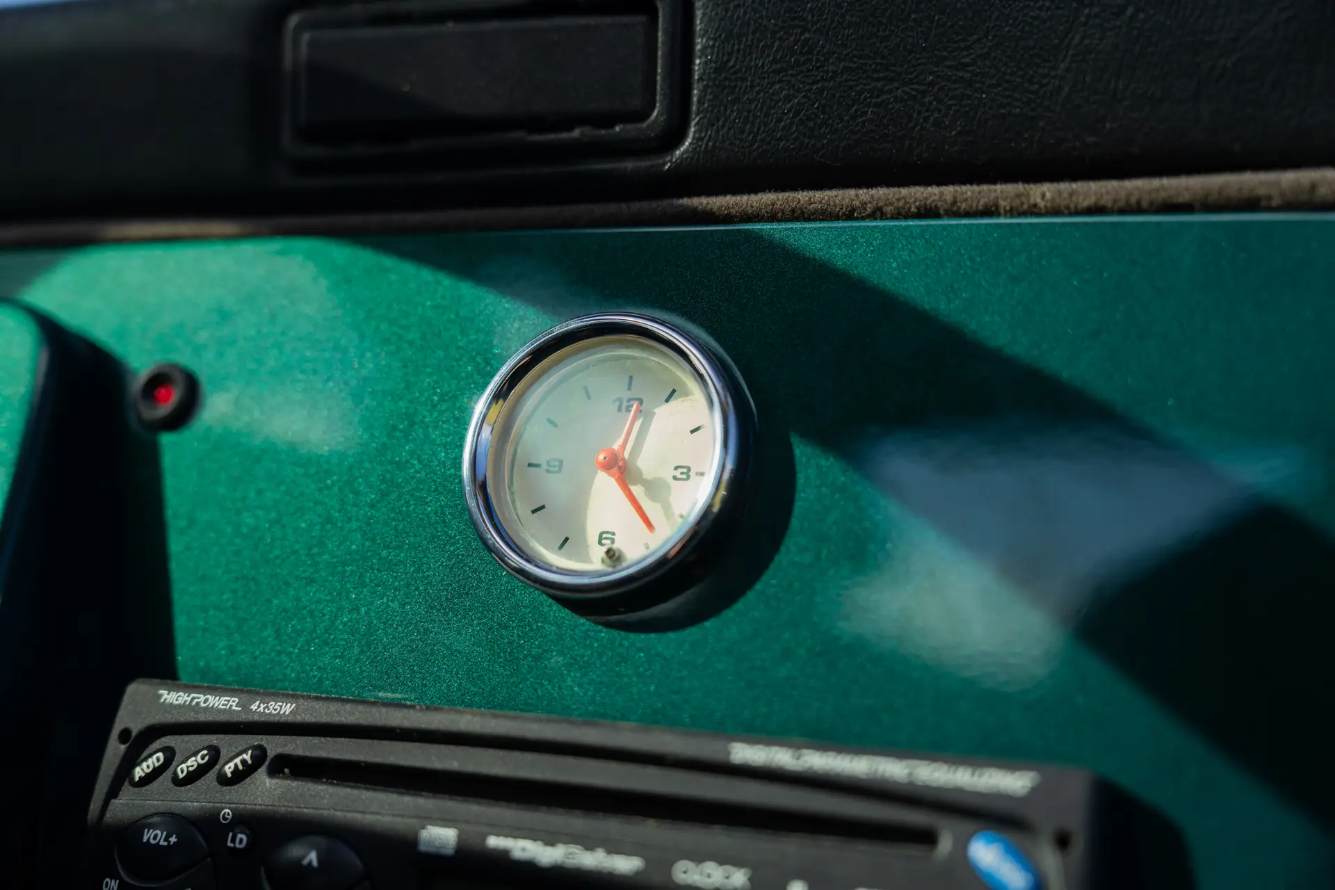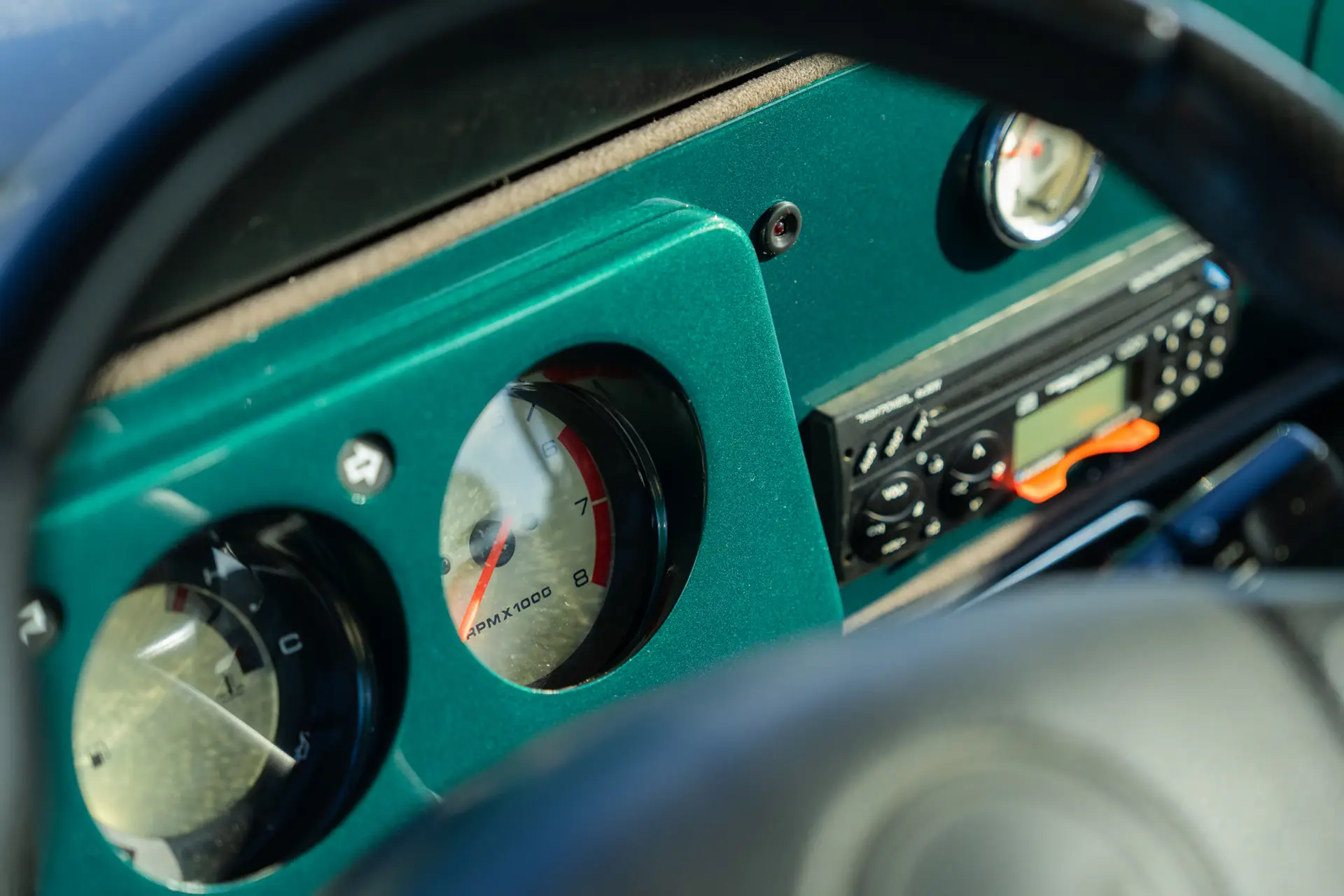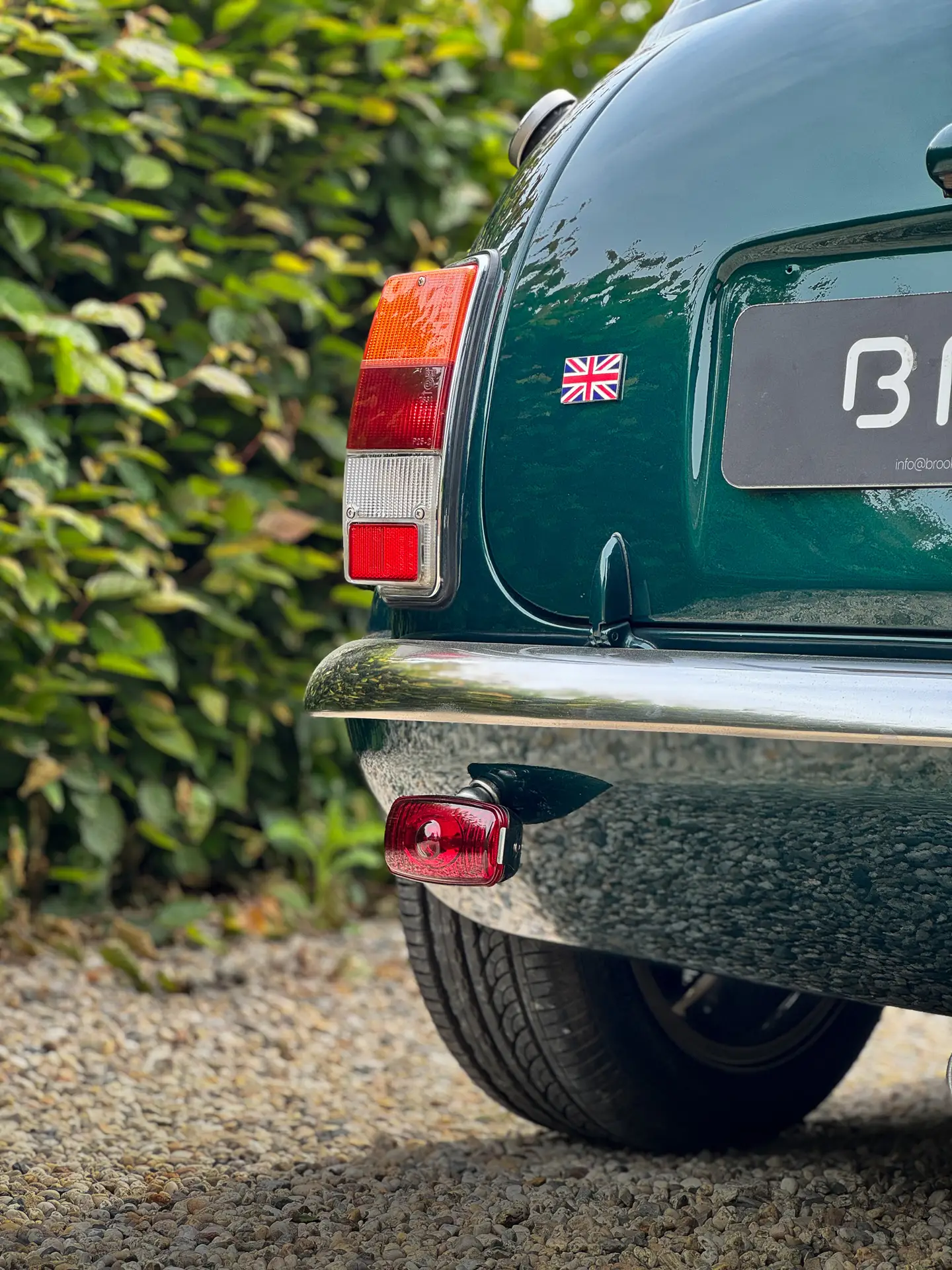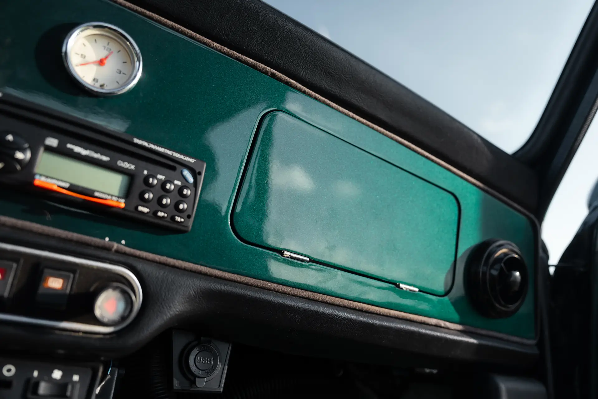 The interior is well-preserved, featuring a British Racing Green dashboard with Magnolia dials. There are no signs of wear or cracks, reflecting the car’s light use.
