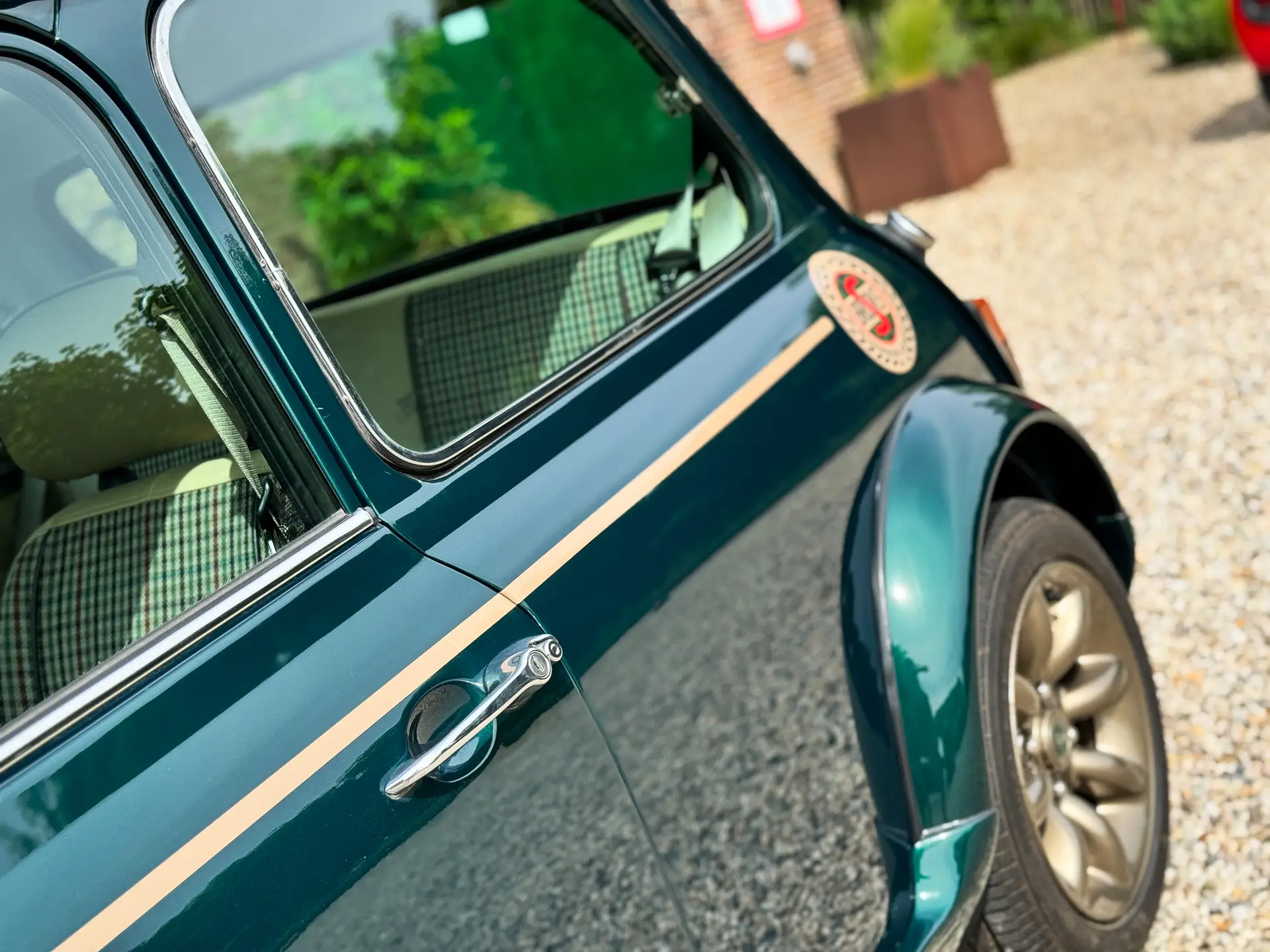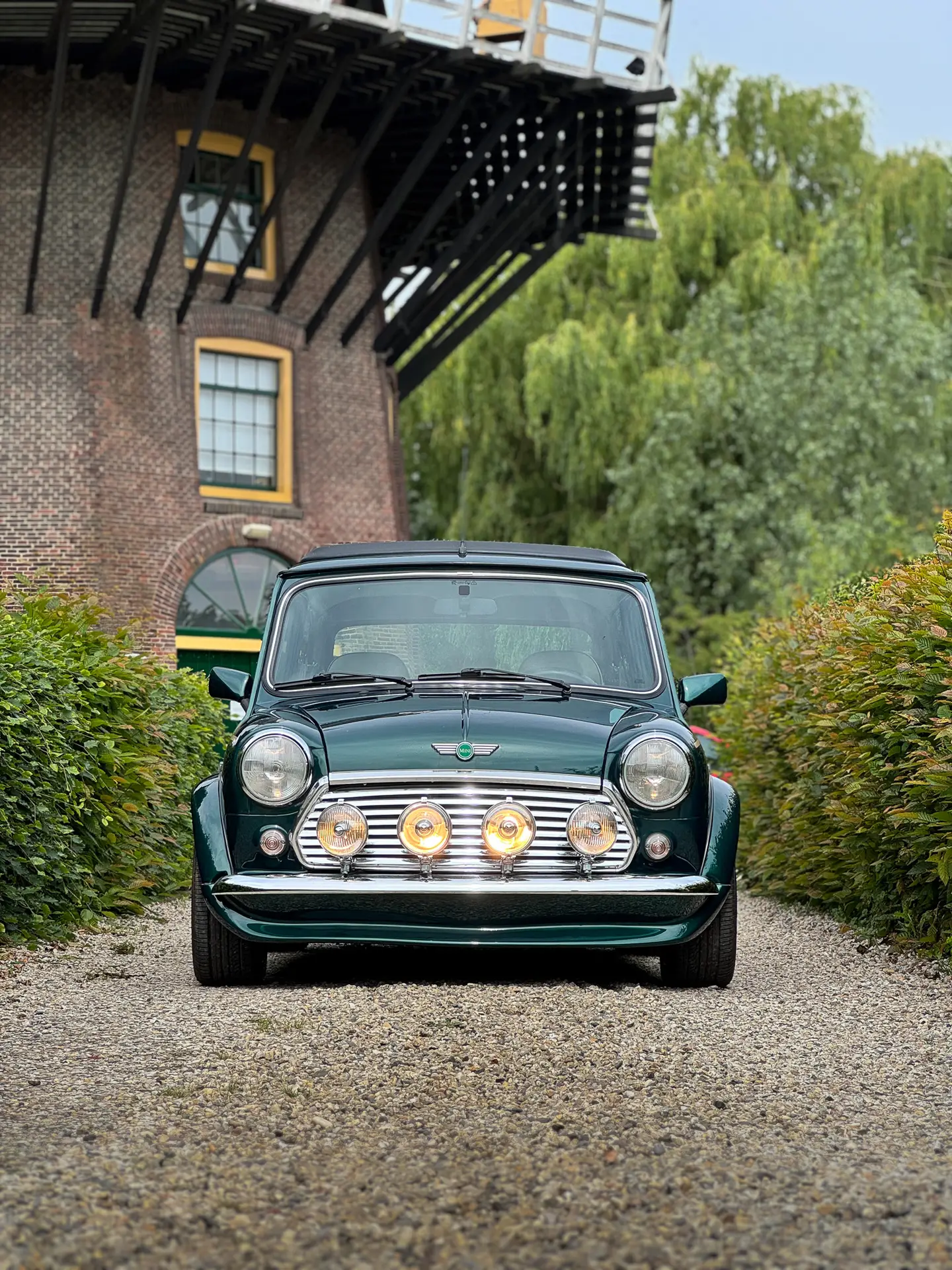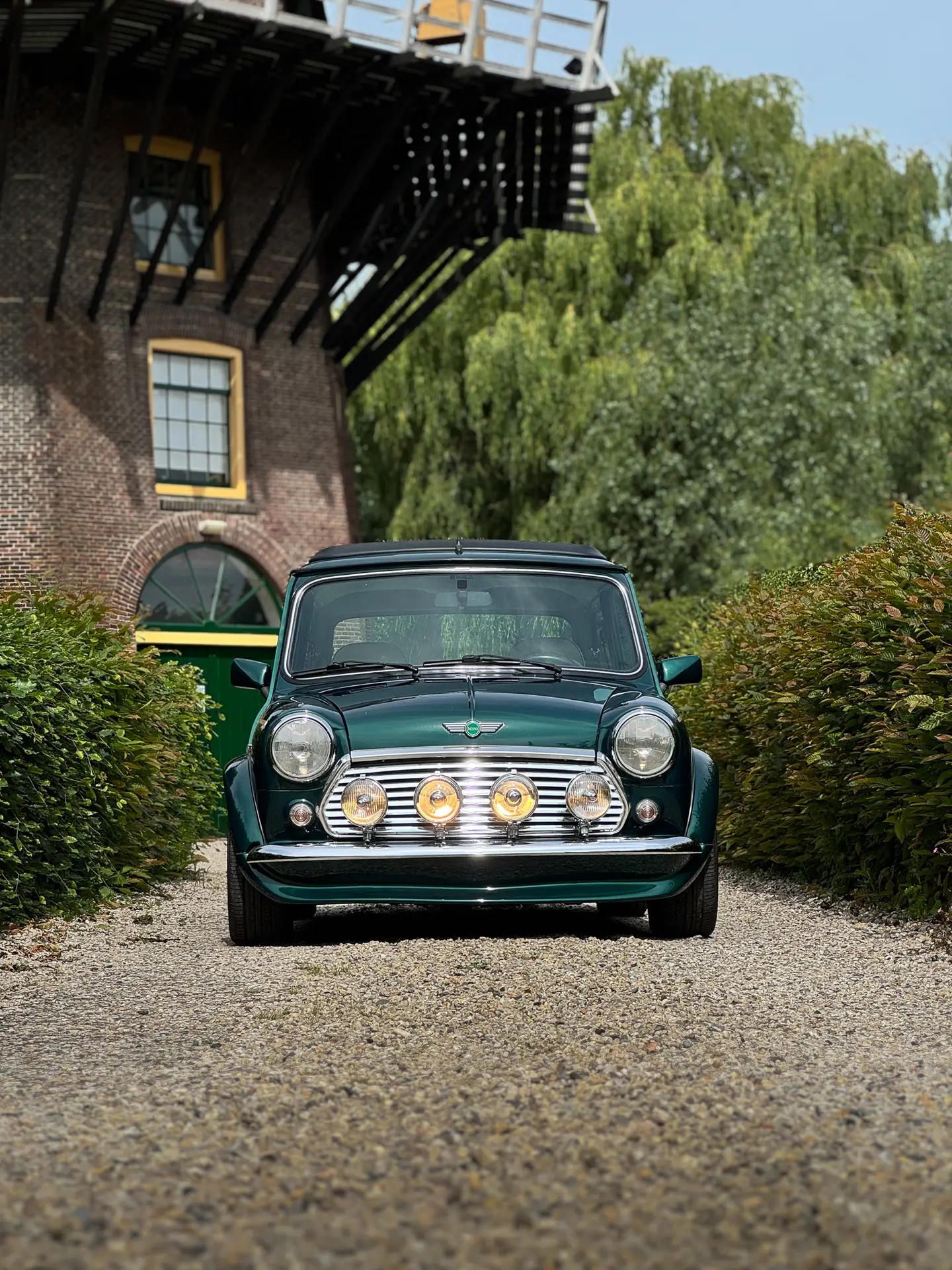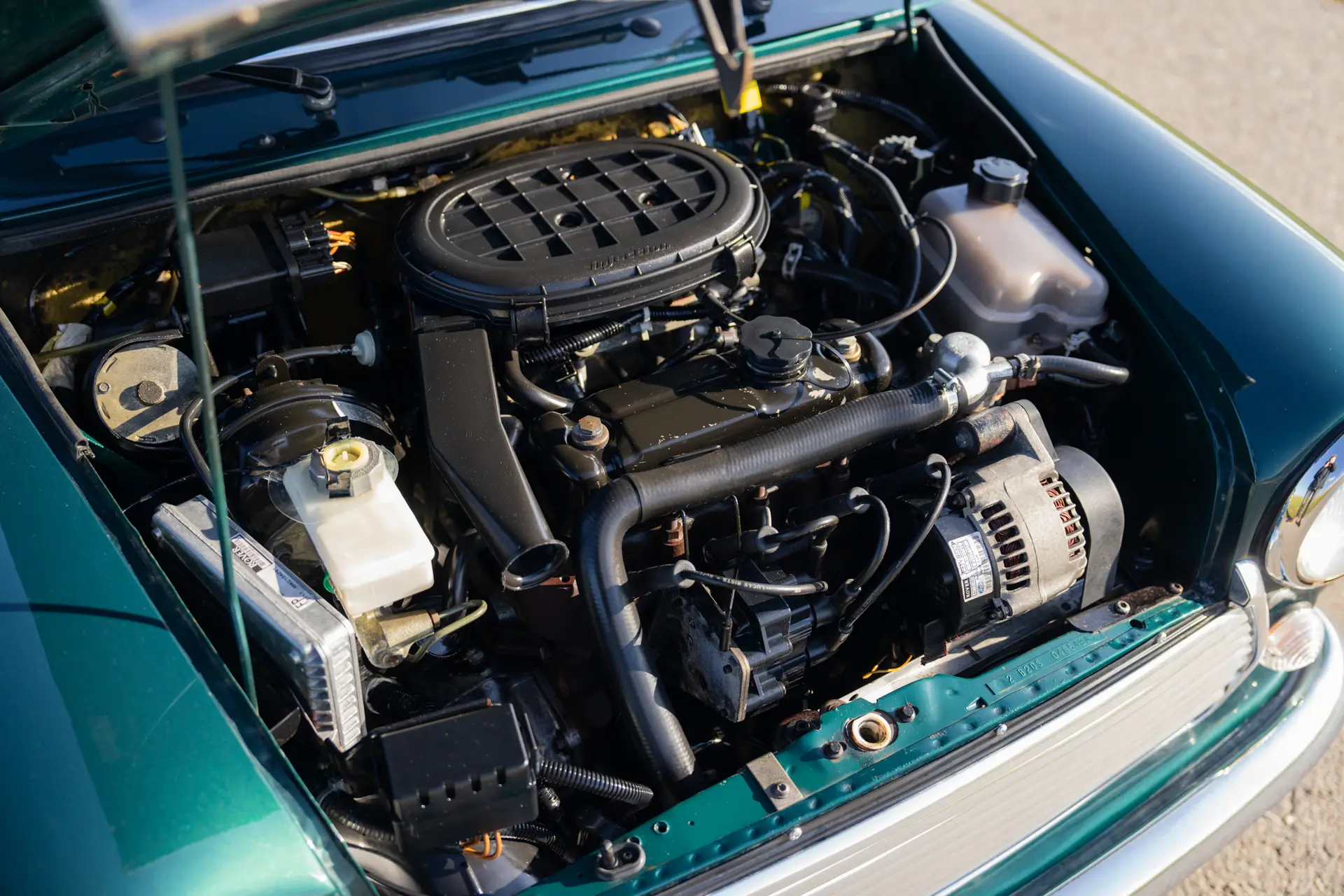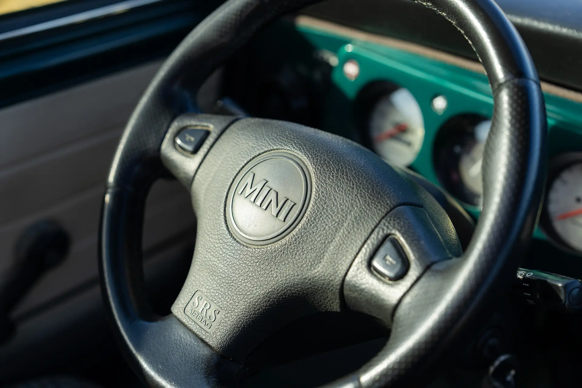 This 1998 Mini Cooper MPi in British Racing Green is in excellent condition. Recently imported from Italy, the car has always been kept under the sun and is completely rust-free. The original paint is stunning, and the underside still has the factory wax. A look in and around the car immediately shows the care and attention given to its maintenance.