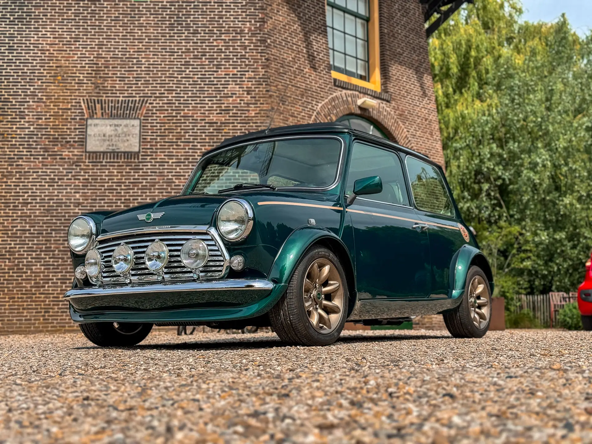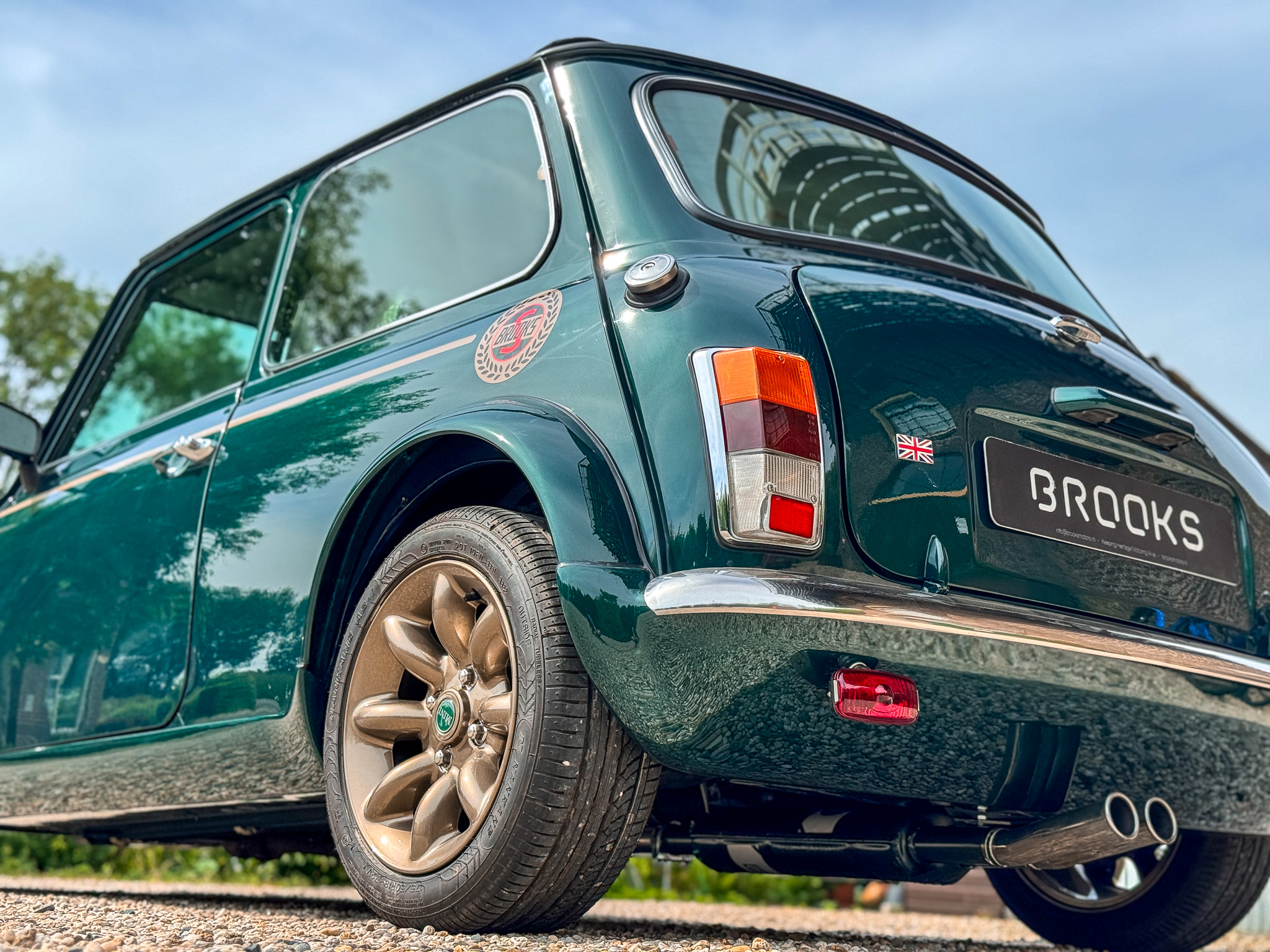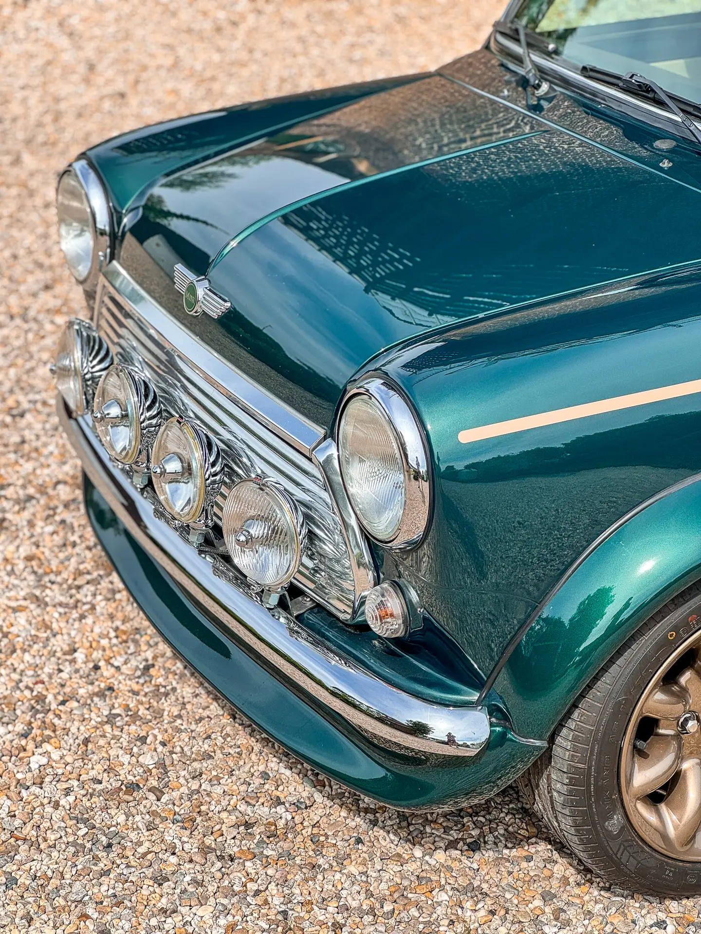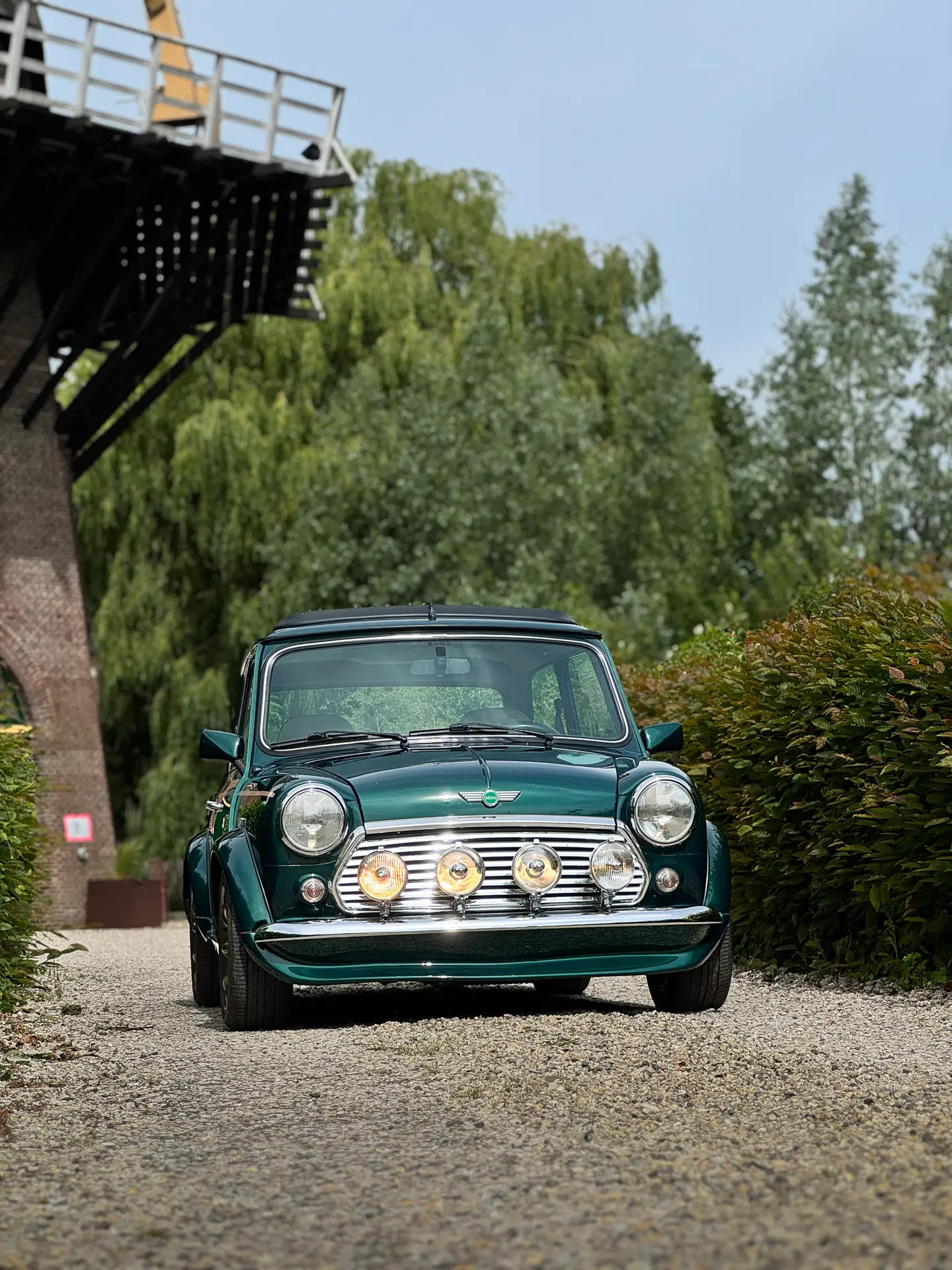 This 1998 Mini Cooper MPi in British Racing Green is in excellent condition. Recently imported from Italy, the car has always been kept under the sun and is completely rust-free. The original paint is stunning, and the underside still has the factory wax. A look in and around the car immediately shows the care and attention given to its maintenance.