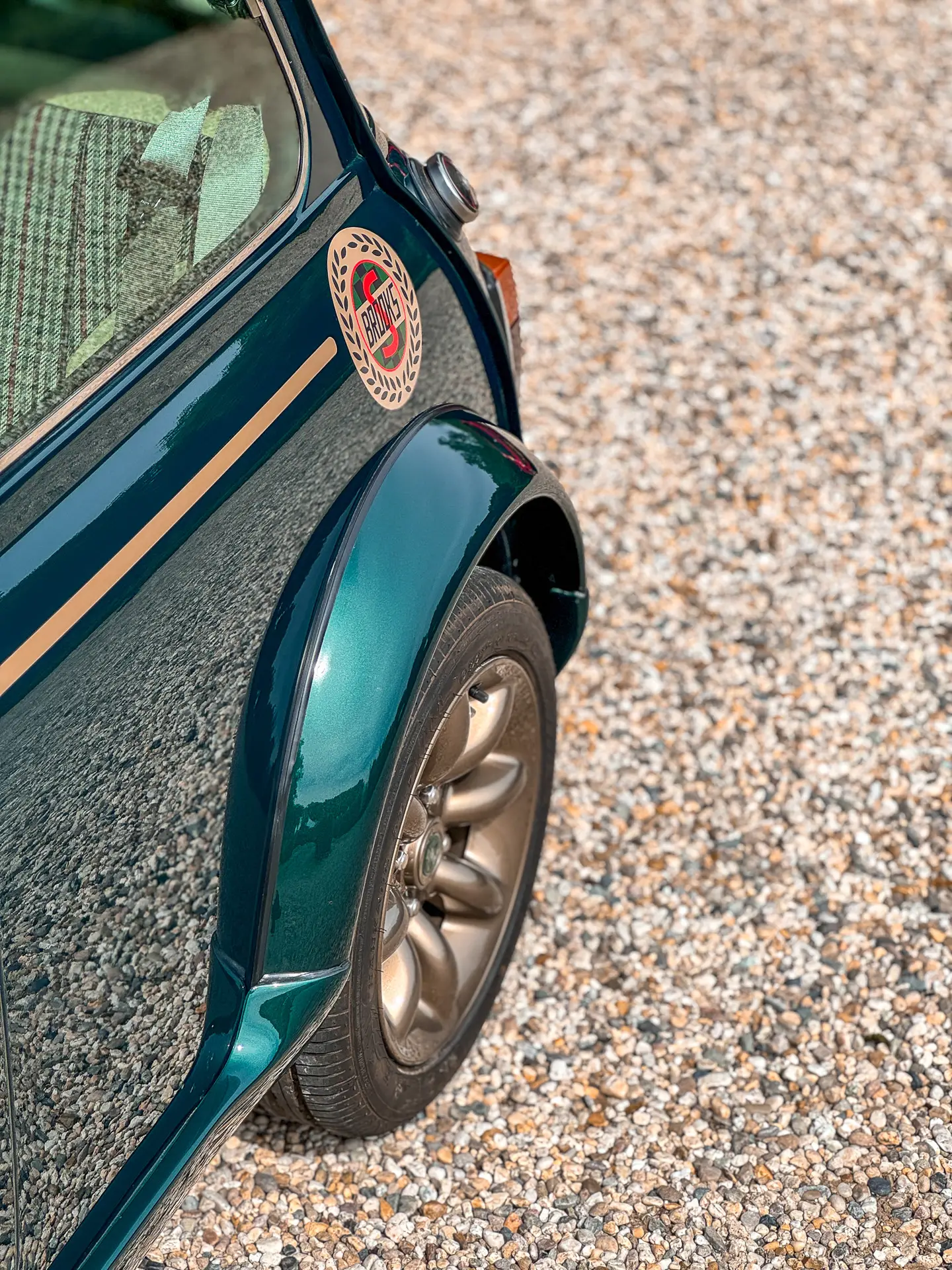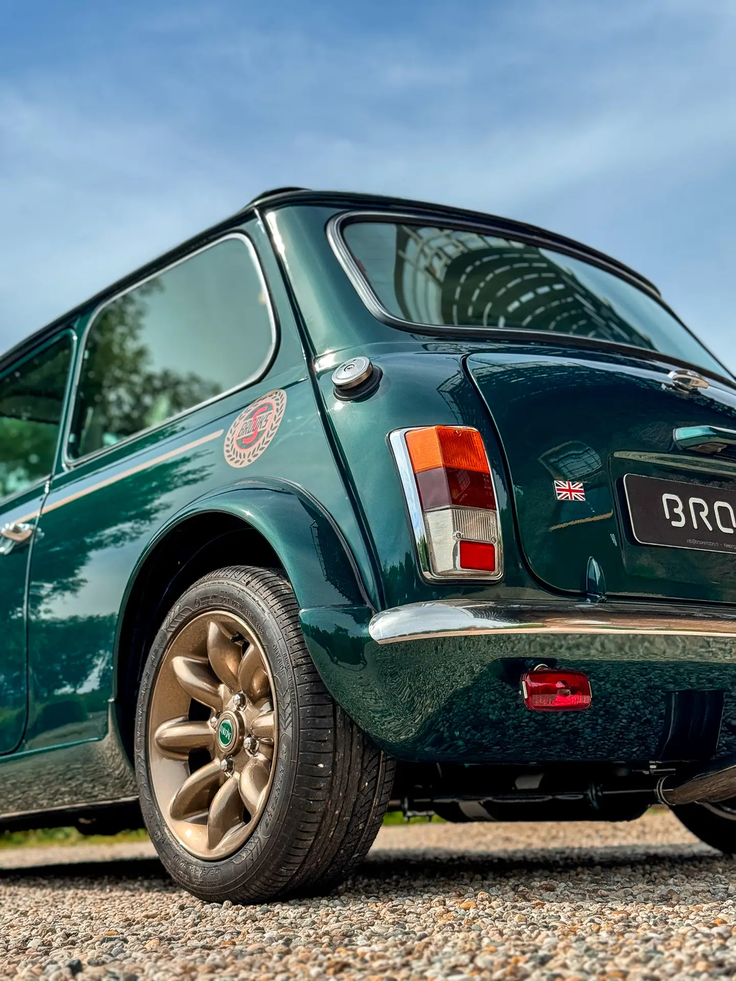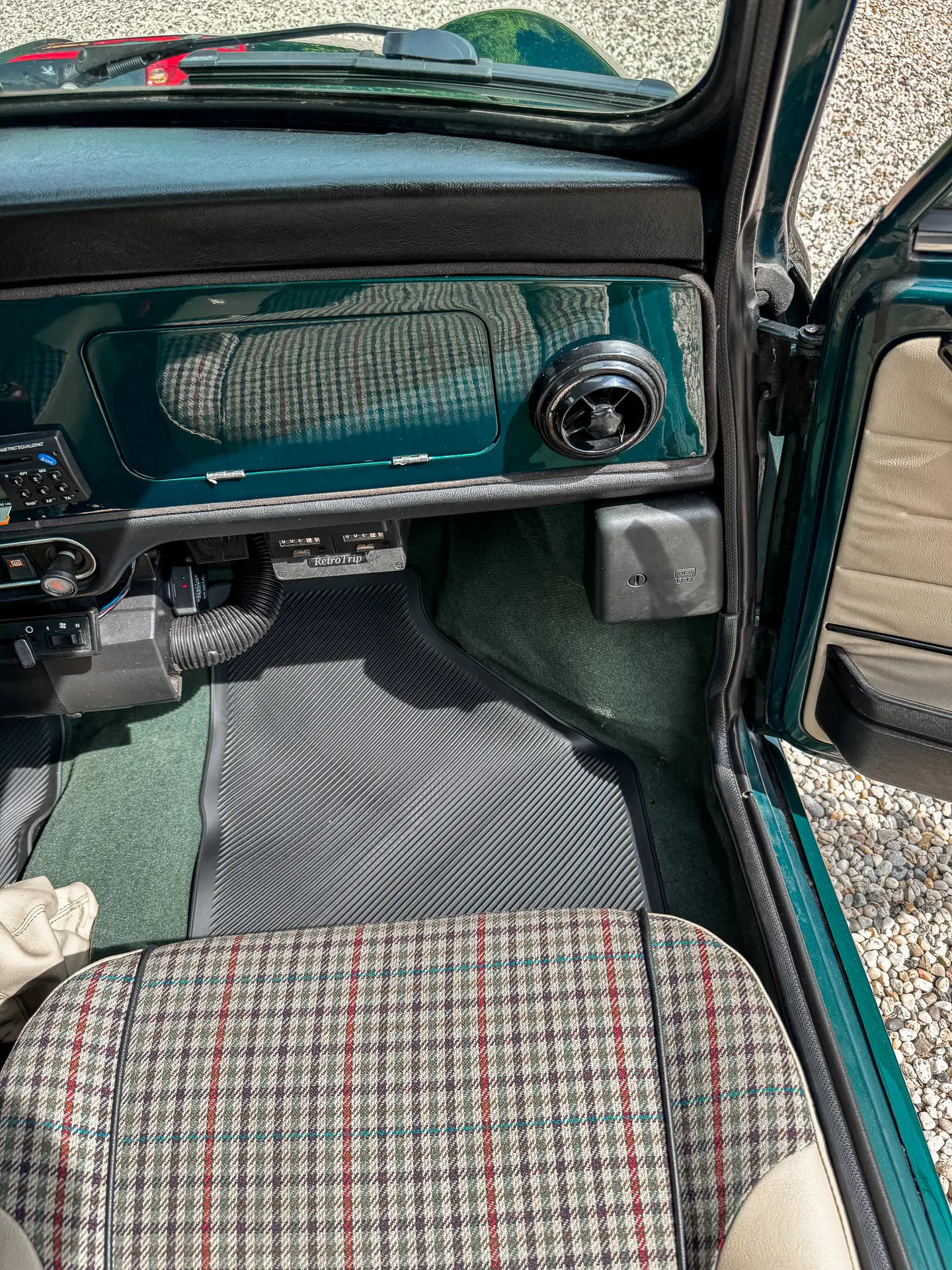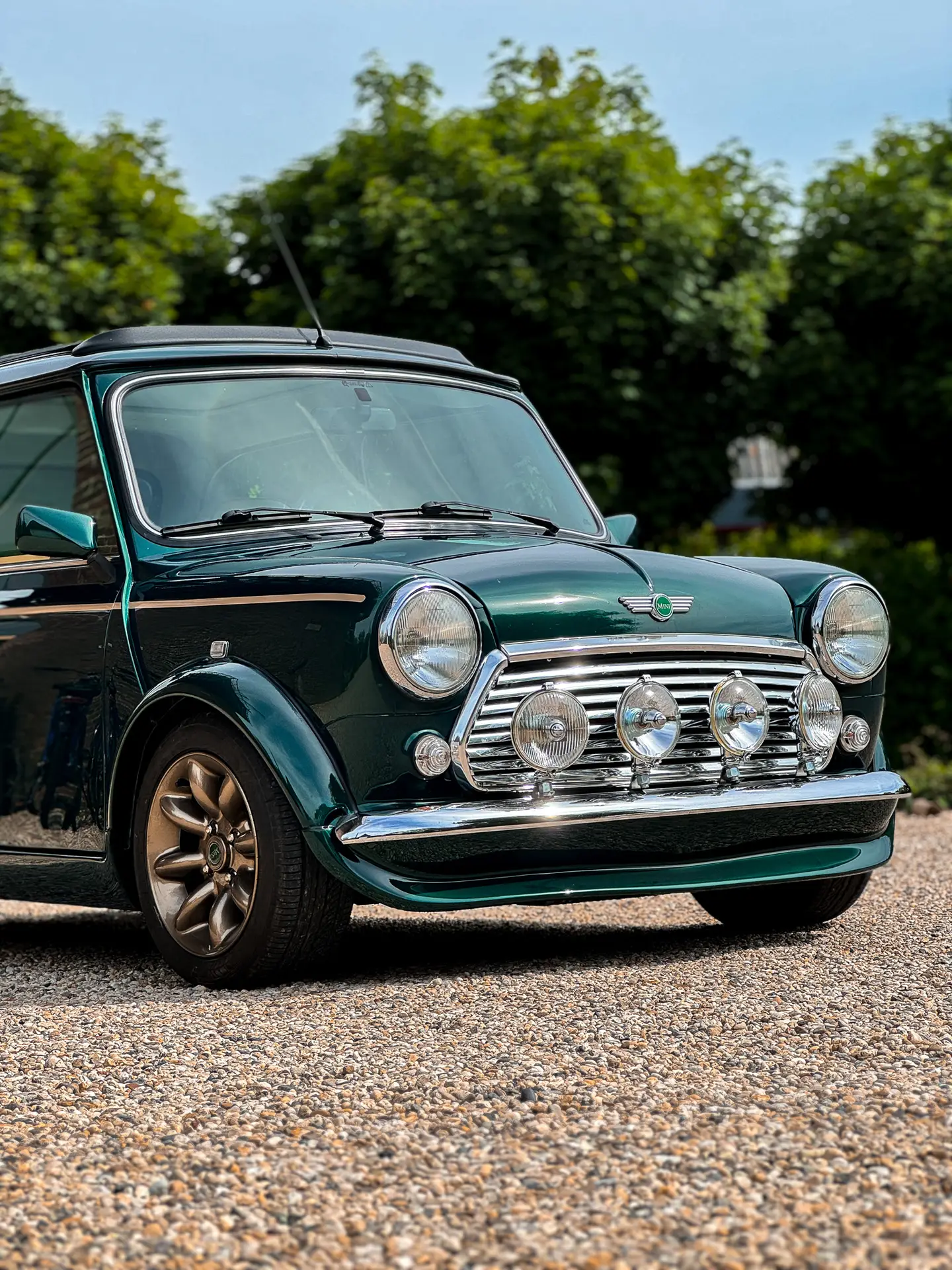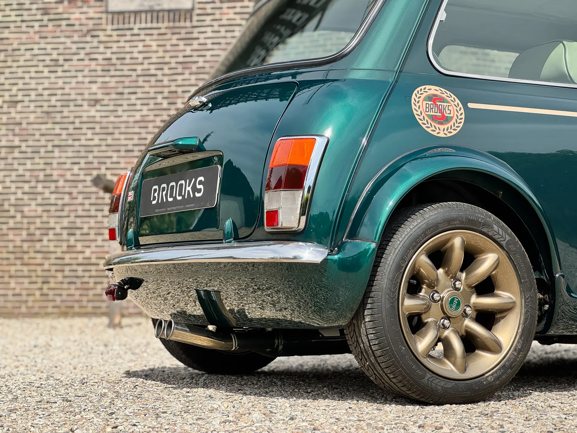 This 1998 Mini Cooper MPi in British Racing Green is in excellent condition. Recently imported from Italy, the car has always been kept under the sun and is completely rust-free. The original paint is stunning, and the underside still has the factory wax. A look in and around the car immediately shows the care and attention given to its maintenance.