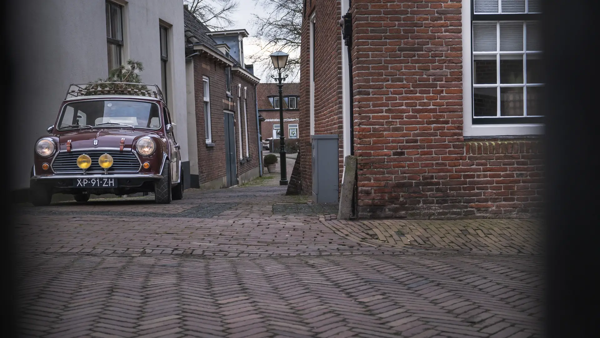 Een donkergroene Mini Cooper rijdend door de polders met links een houten stal