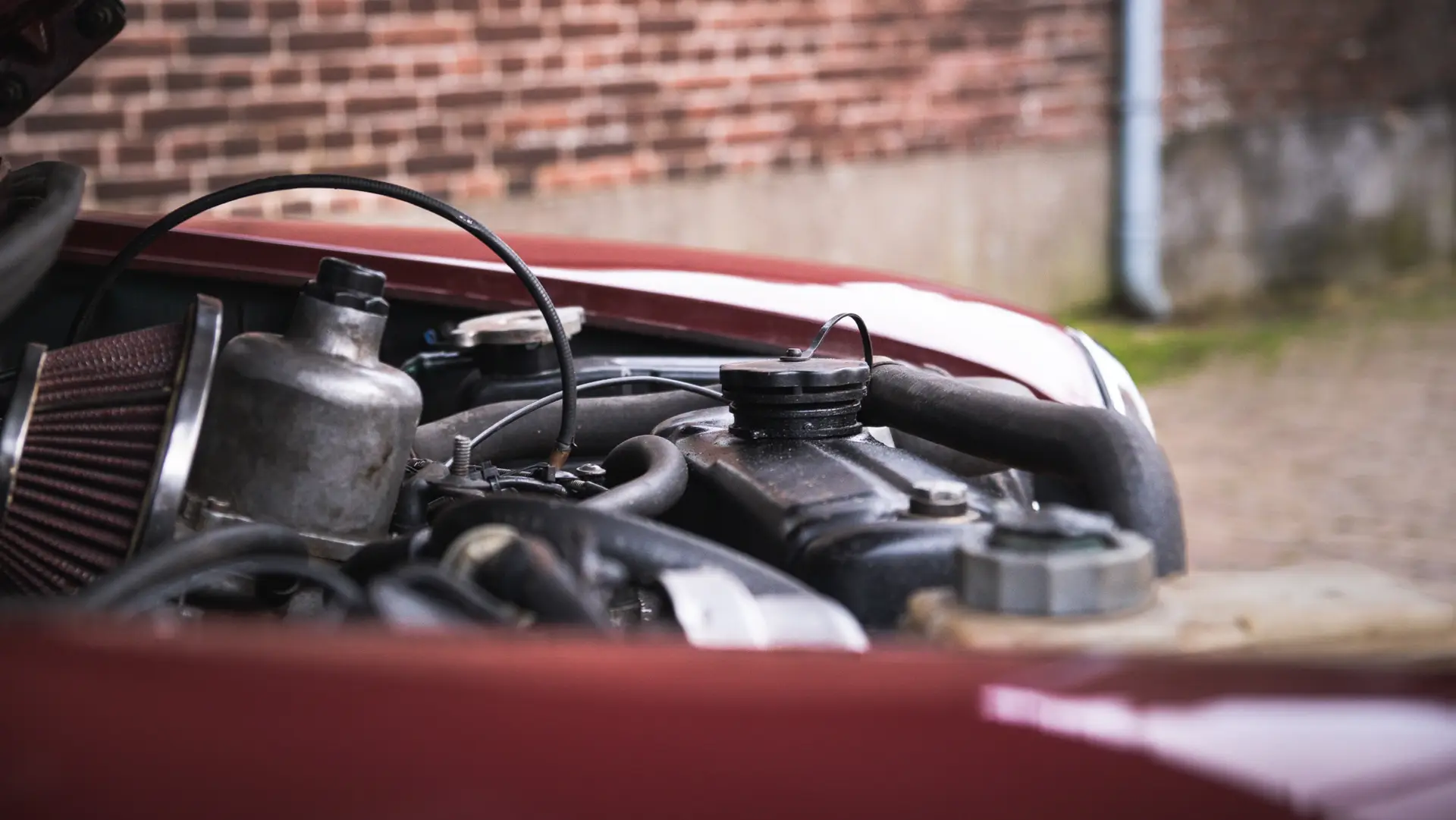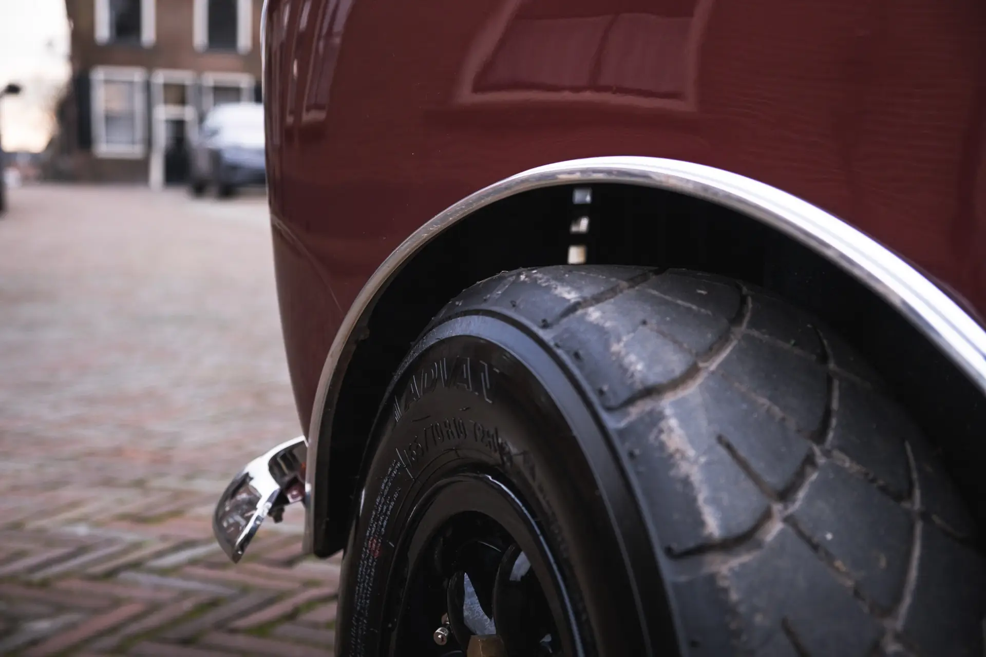 The front image of the whole dark red Mini Classic, taken from a high standpoint
