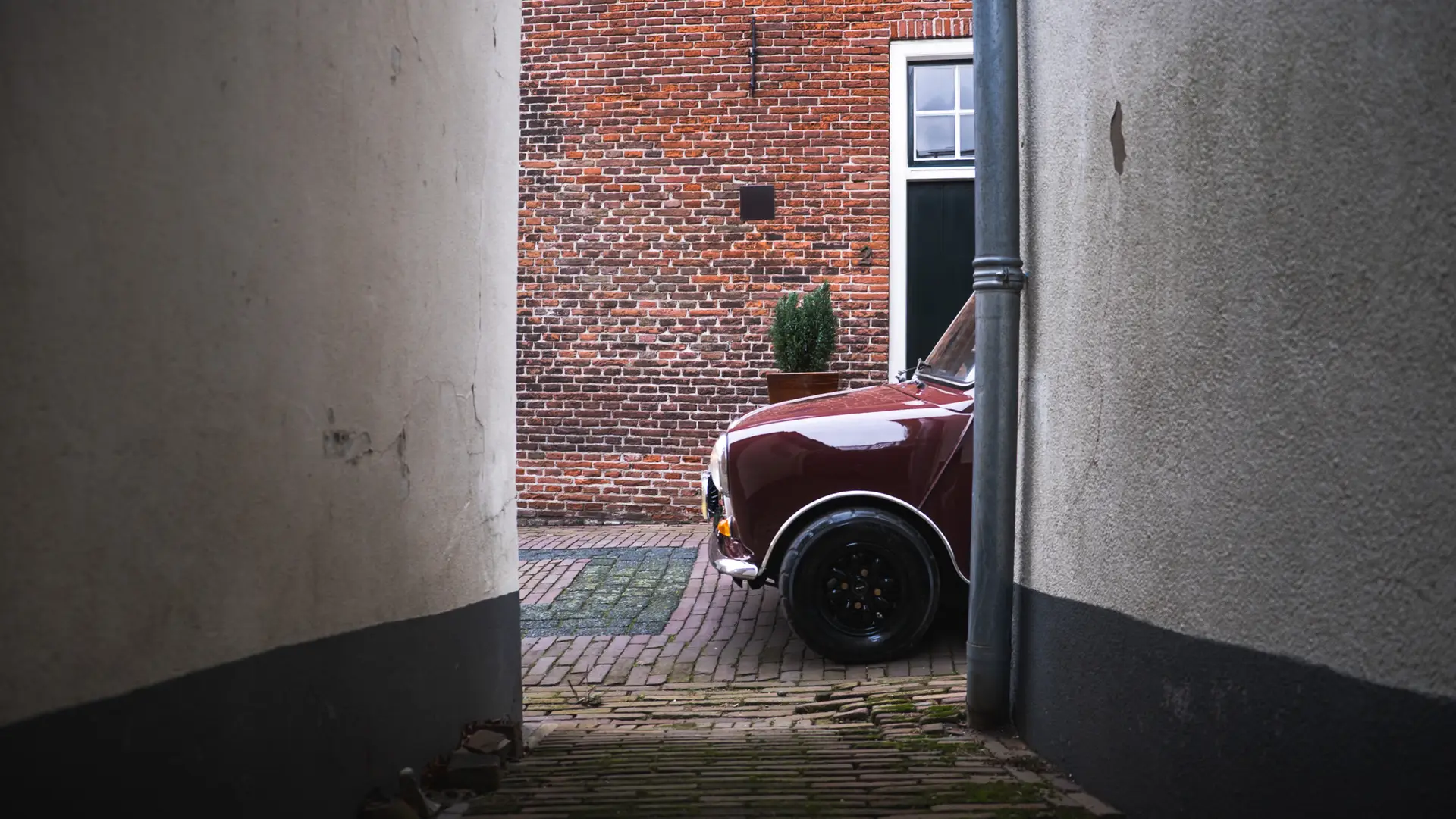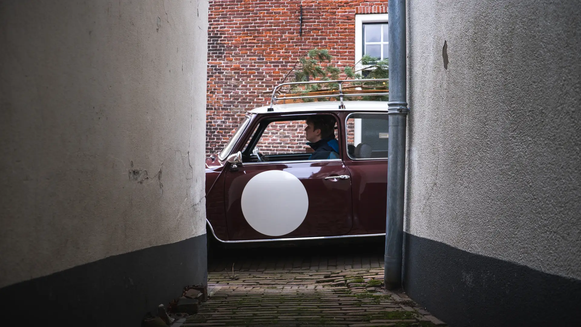 A black Mini City driving out of the alley