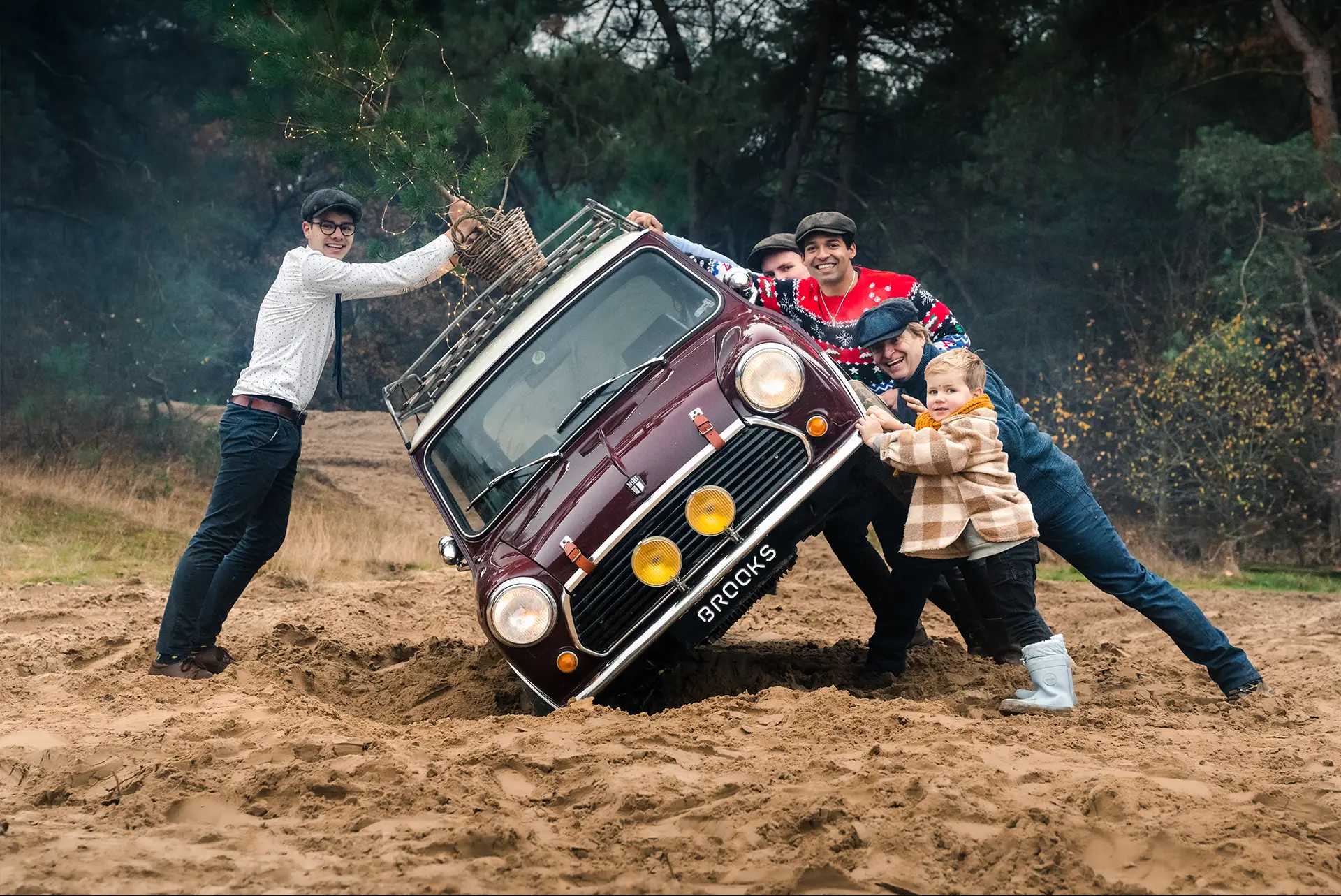 Mini classic in full DAKAR off road style in the dunes of marokko