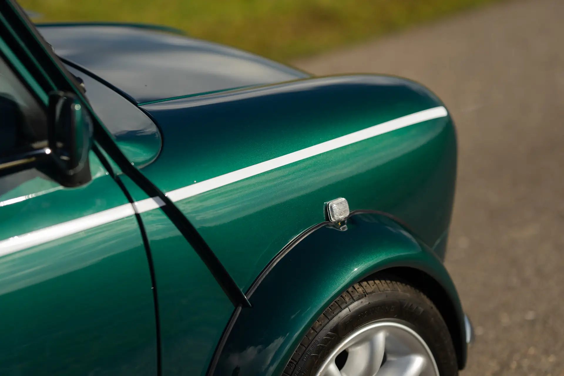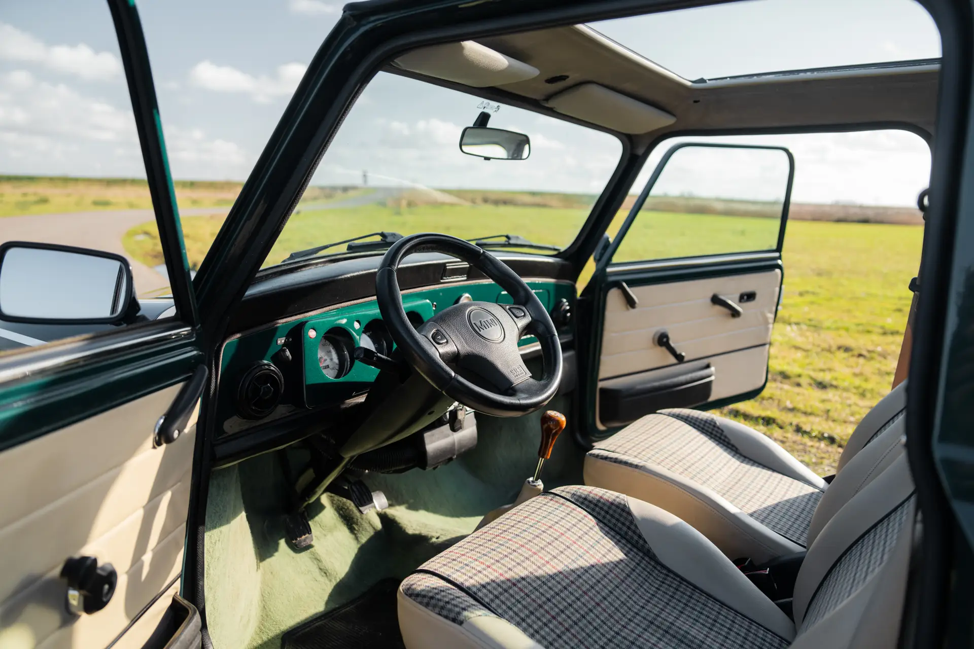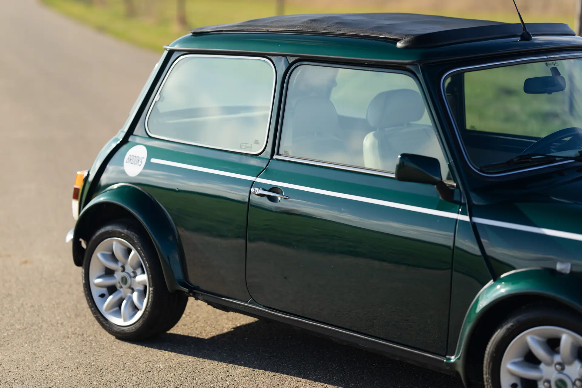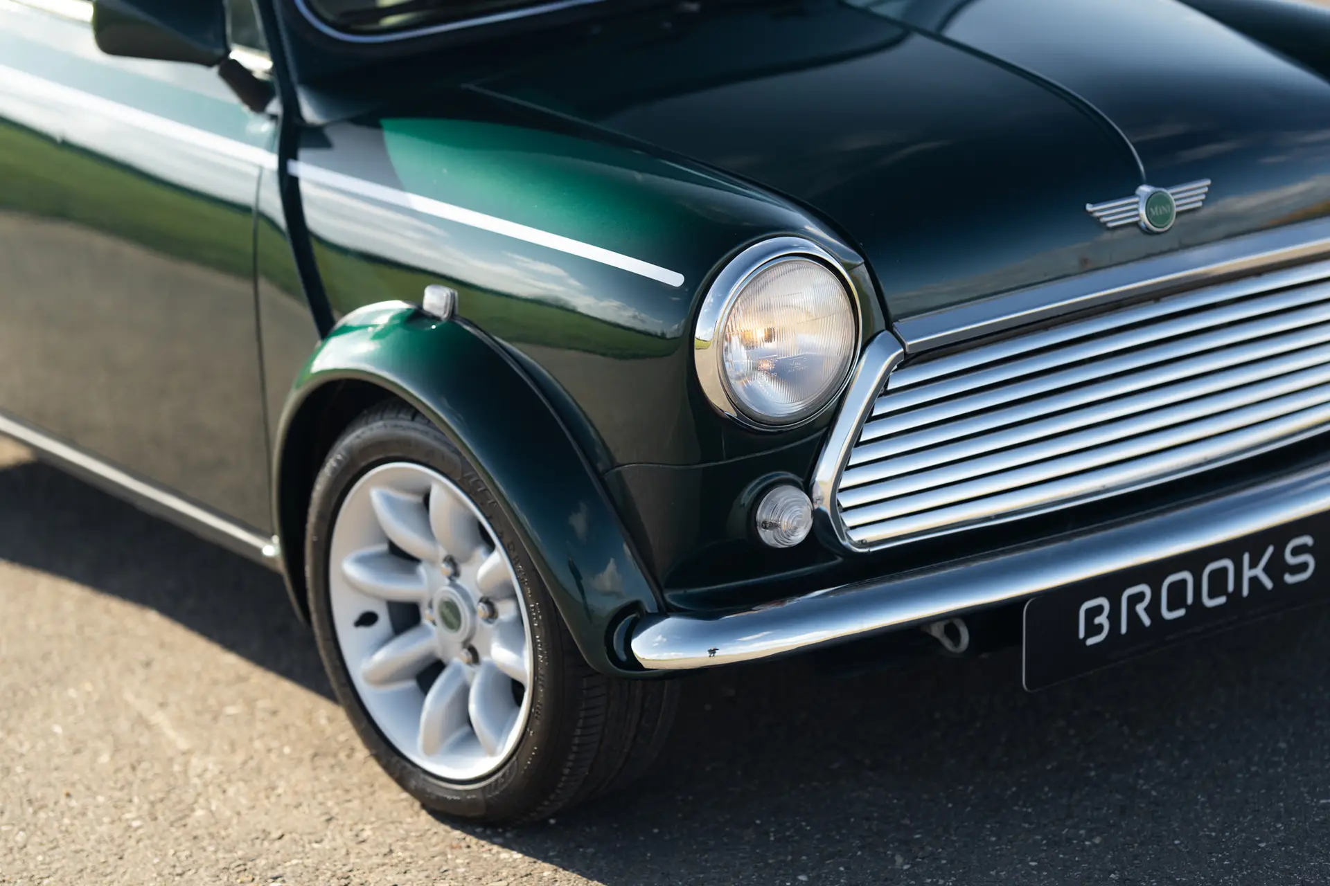 This 1998 Mini Cooper MPi in British Racing Green is in excellent condition. Recently imported from Italy, the car has always been kept under the sun and is completely rust-free. The original paint is stunning, and the underside still has the factory wax. A look in and around the car immediately shows the care and attention given to its maintenance.