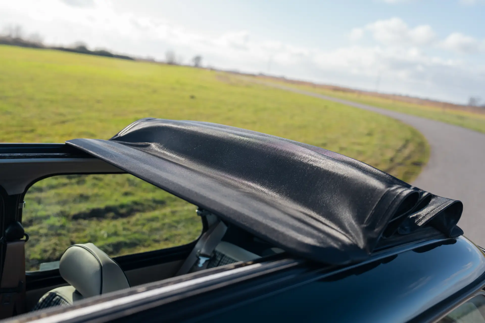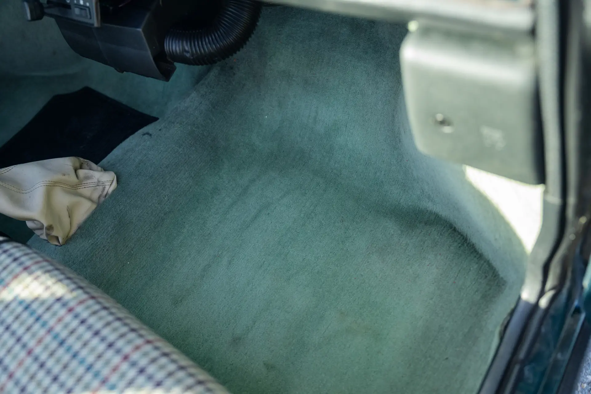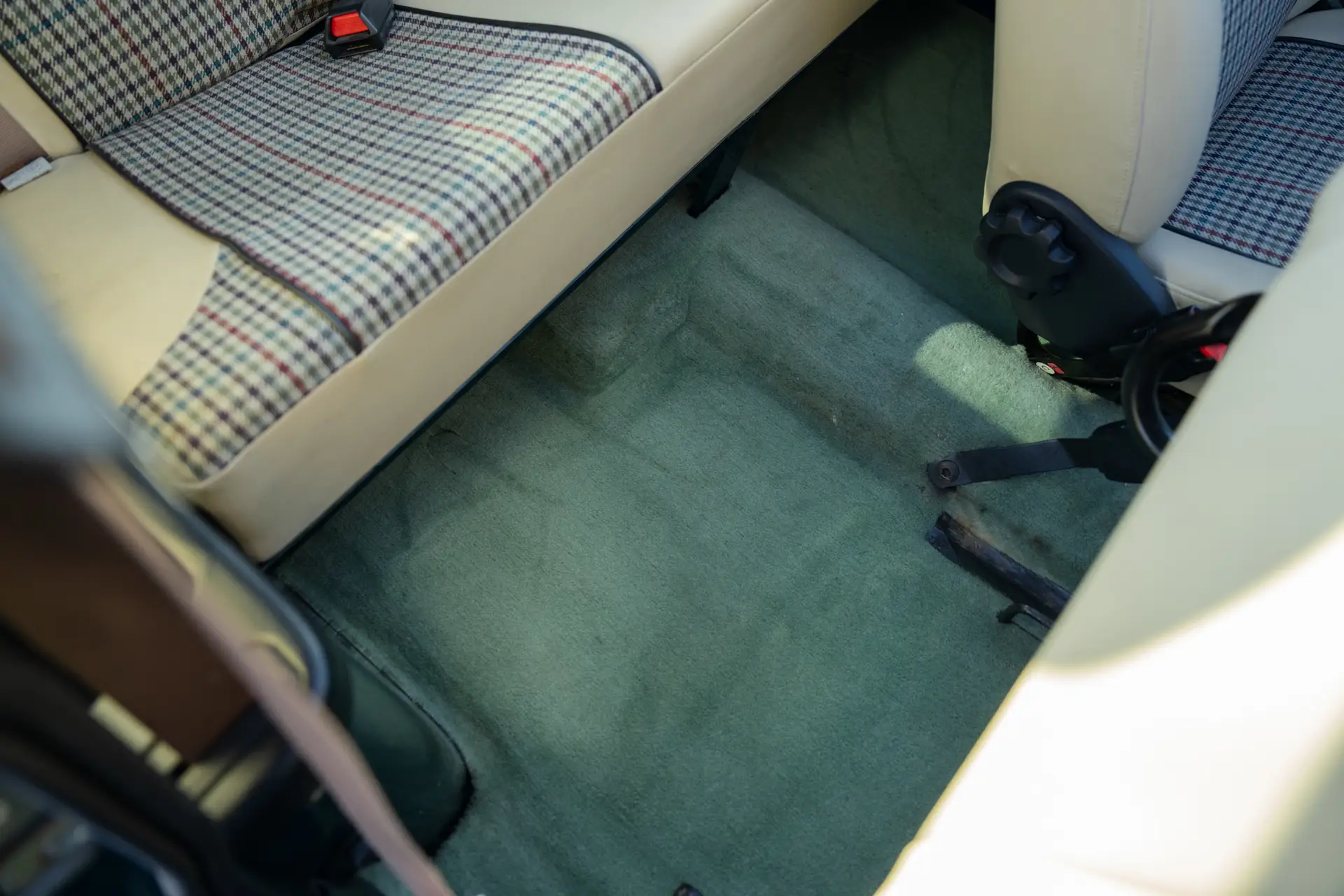The interior is well-preserved, featuring a British Racing Green dashboard with Magnolia dials. There are no signs of wear or cracks, reflecting the car’s light use.